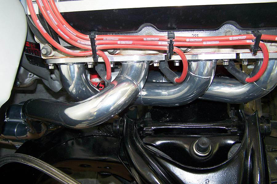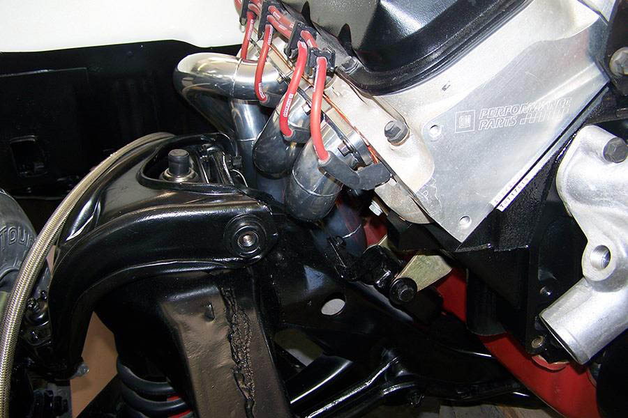 The steering column is the big issue with this chassis, but we still have good access the spark plugs. The header is also designed for clutch linkage and a power brake booster. If you are using a Lakewood type scatter shield you will have to slightly trim the outer edge of it under the starter area for header clearance. If your car has factory air conditioning we can make the header for that.