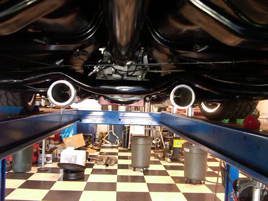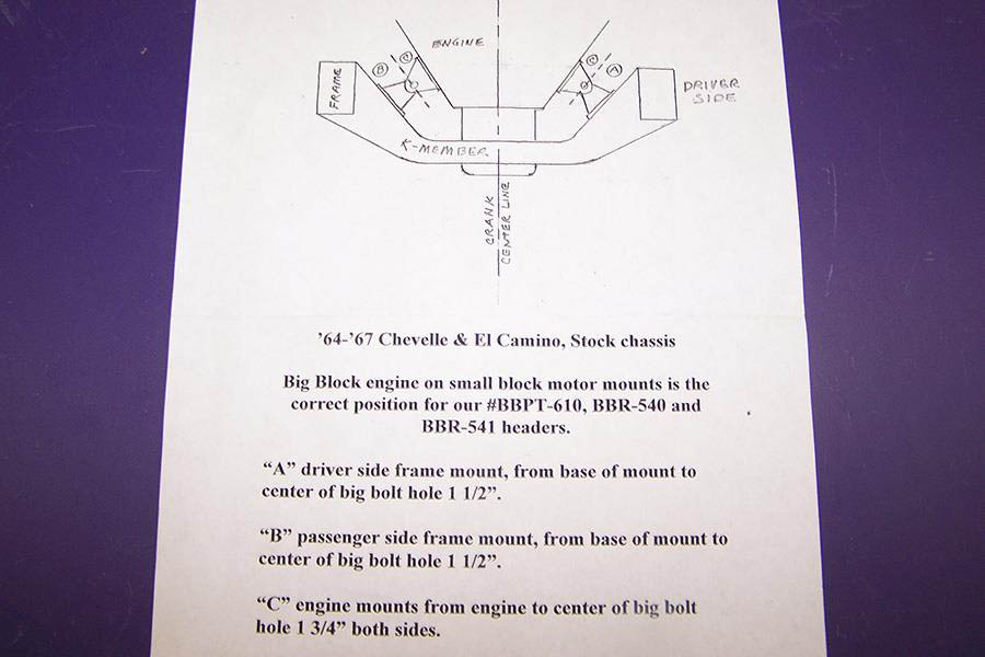 This header is available in a 2” or 2 1/8” tube size with a 3 ½” collector. All of the tubes are inside the frame. Our headers are hand made to order, so we can build them for any engine deck height and for any aftermarket cylinder head as long as the engine stays in the stock location. On the ’64 thru ’67 Chevelle chassis, small block frame stands for the front motor mounts are required. We used Prothane polyurethane engine mounts #7-504 to design with. The header will also fit solid motor mounts Moroso #62530.