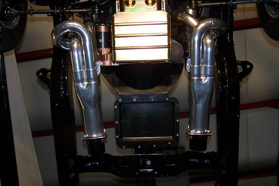 This header is designed for any tube size up to 2 ½” with any collector size up to 5” or our collector muffler up to a 6” size. It has all the tubes inside the frame with excellent ground clearance and spark plug access. On our design car we used a Milodon low profile oil pan #30950 and #30955 to design with and the bottom of the header was ¼” below the bottom of the pan. Measuring from the side of a stock oil pan we have 3” of room on each side for sump kick outs. This header will fit on side motor mounts or motor plates. Engine position is critical! Use small block front mount frame stands to position the engine with Moroso #62530 solid motor mounts. Rubber or Polyurethane motor mounts will have to be trimmed for clearance. Ask our sales person for more information. Any mini starter will fit, but a full size GM starter will not fit. The header tubes are to the outside of the oil filter so if there is no oil pan kick out on the driver side the filter is easily accessible, but if your oil pan kicks out under the filter it will be trapped and you will need a remote filter. If you will be using our collector mufflers you may need our tubular transmission cross member #CAMX67 for additional room.
