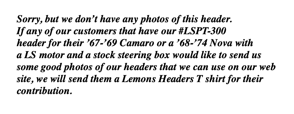 #LSPT-300 – ‘67-’69 CAMARO LS-1 TO LS-7 – ‘68-’74 NOVA LS-1 TO LS-7 – LS Pro Tour header for stock chassis with stock steering box