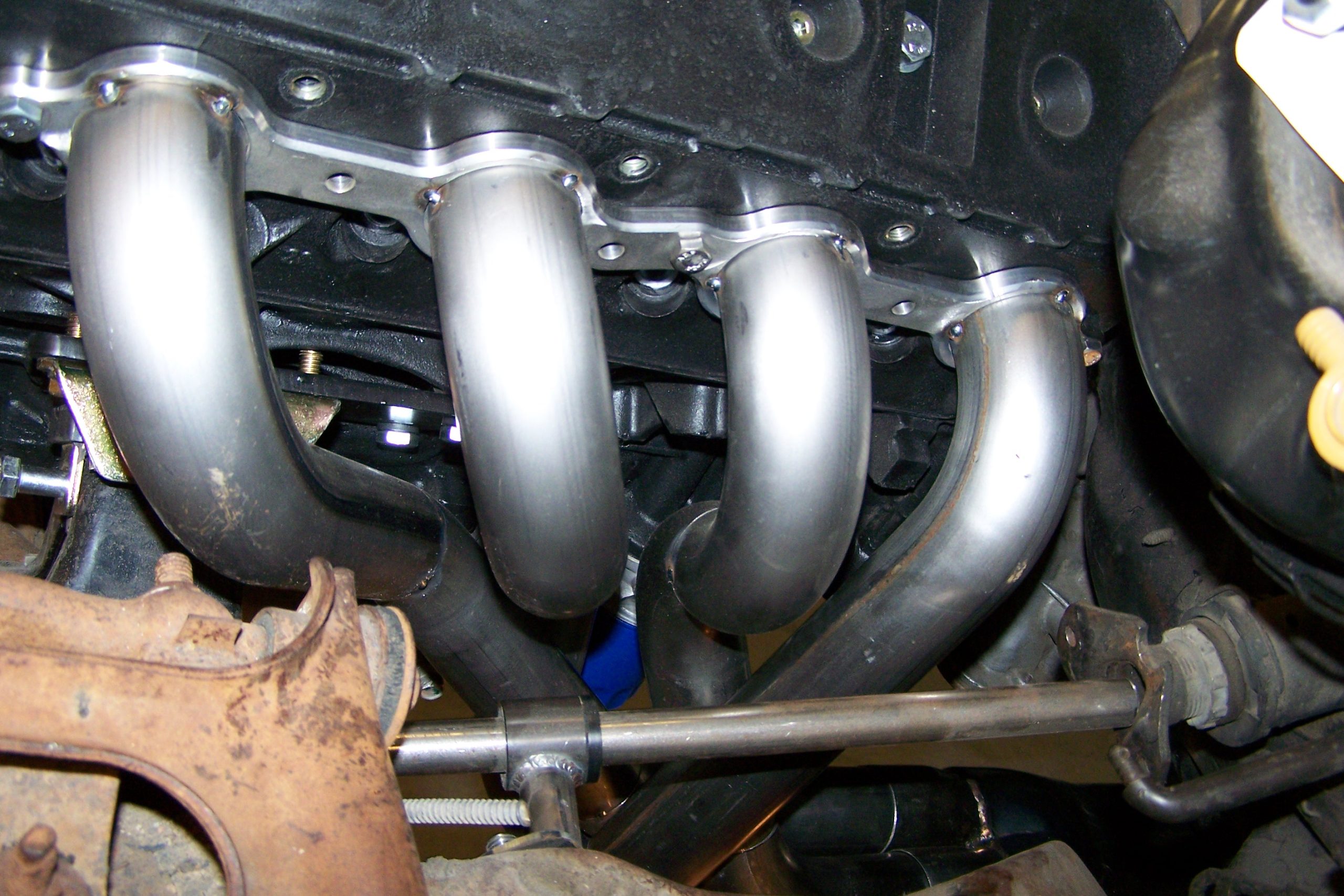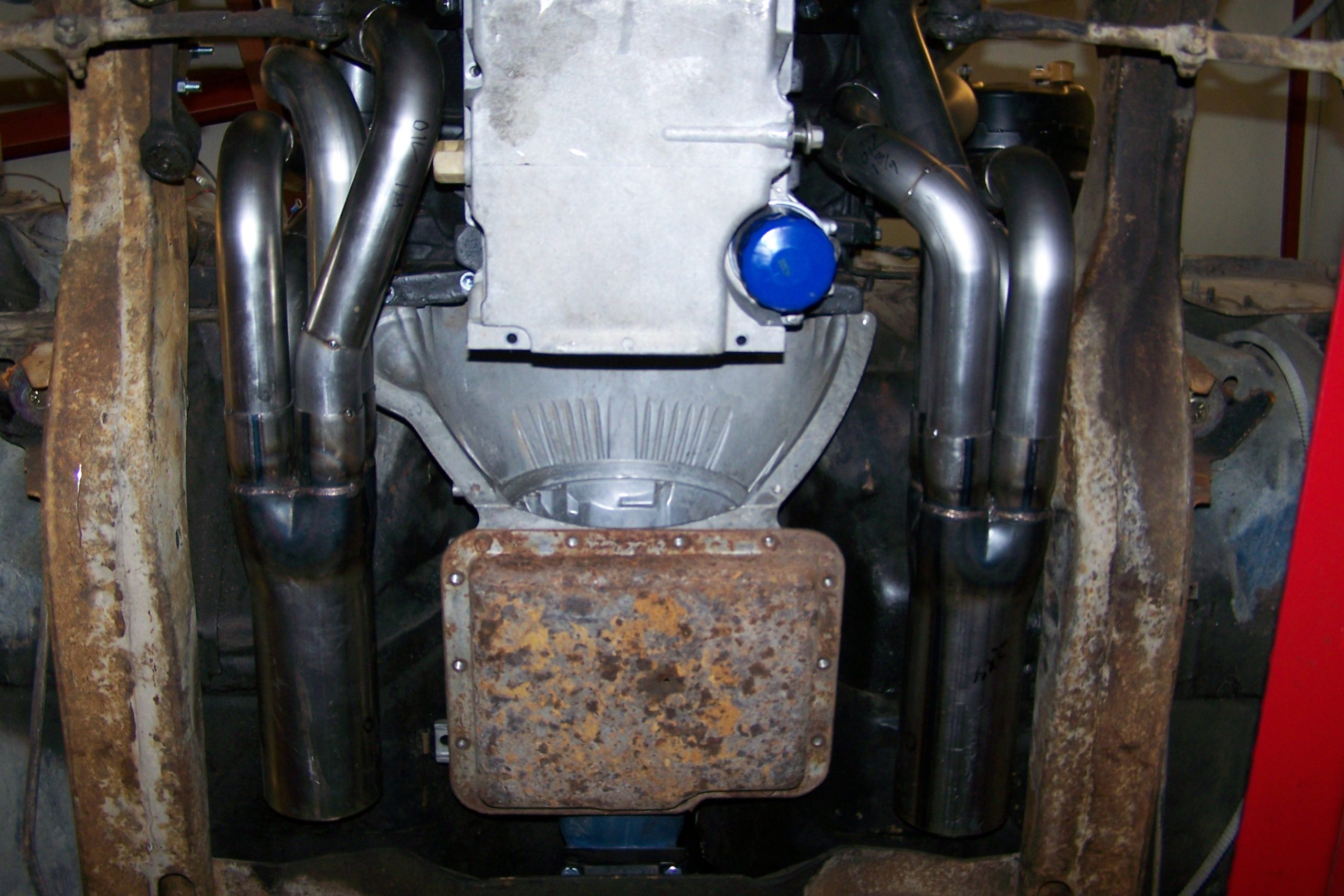 All the tubes are inside the frame, with excellent ground clearance and spark plug access. The header is designed for aftermarket oil pans with kick out sides. The available room from a stock oil pan is 4 ½” on the passenger side and 4” on the driver side. This provides easy access to the starter and oil filter. You can use a stock starter or aftermarket starter.
