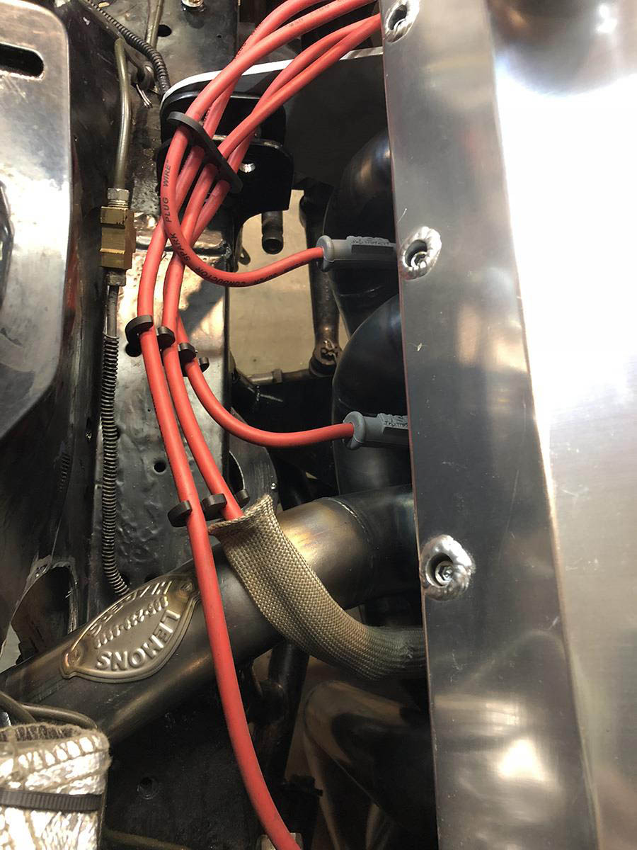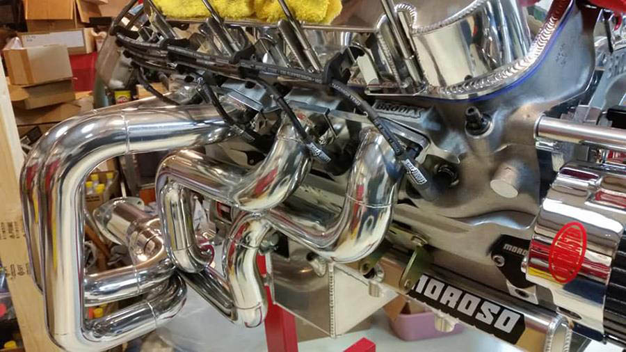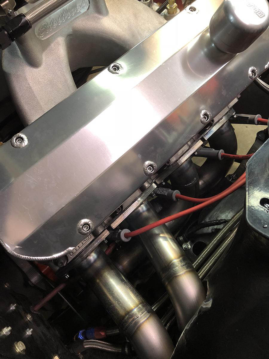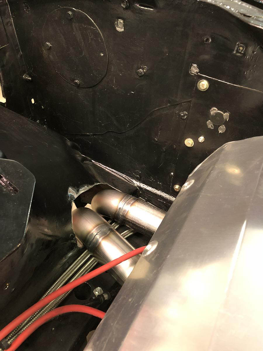 Measuring from a stock oil pan it has 4” of room on each side for large sump kick outs and the bottom of the header is even with the bottom of a typical race pan. The lowest part of the header is the collectors because of the floor board. With no kick outs on the oil pan the starter and oil filter are easily accessible. Spark plug access is very good you can get a socket on all plugs. If you have wide front tires and wheels with an offset to the back side then the tires will rub at a full turn, the header is designed for skinny drag type tires. Any exhaust system will have to run down the drive shaft tunnel. If your raised port heads are over .600 higher than stock you will have to replace the steering column rag joint with a smaller “U” joint to make room for #7 tube. The header is designed for side motor mounts or motor plates and will fit many aftermarket “K” members, but the engine must stay in the stock location.