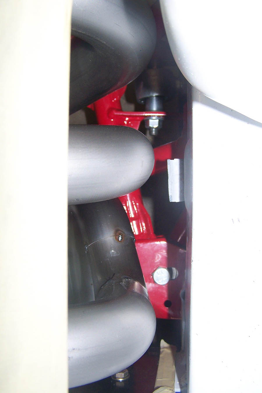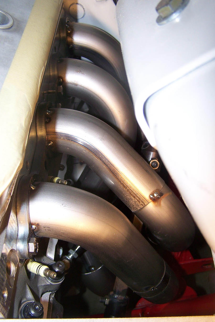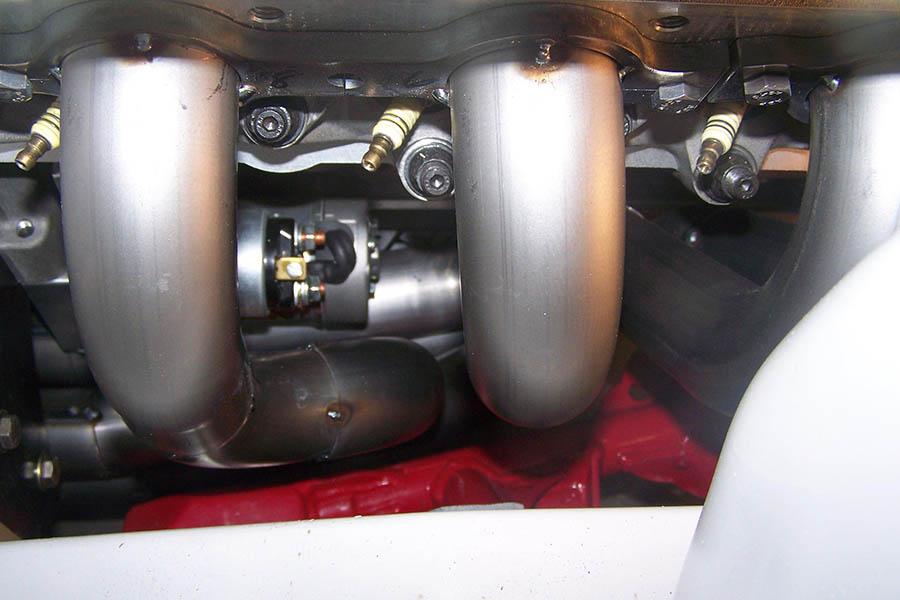 Passenger side: with the engine in place and starter and spark plugs in place you can install the rear 2 tubes from below, do not start any header bolts. Next install the front 2 tubes from below and then bolt both header sections in place.