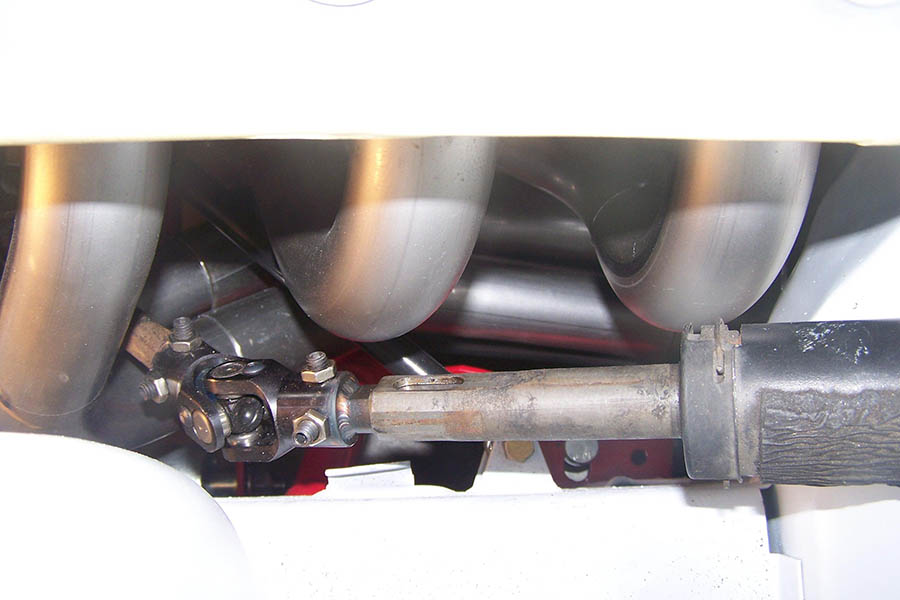 Driver side: remove the center section of the steering column between the 2 “U” joints. Install the front 2 tubes from below. Start front header bolt to hold tubes, but leave the header tubes loose and reinstall the steering column. Next install the rear 2 tubes and bolt both header sections in place.