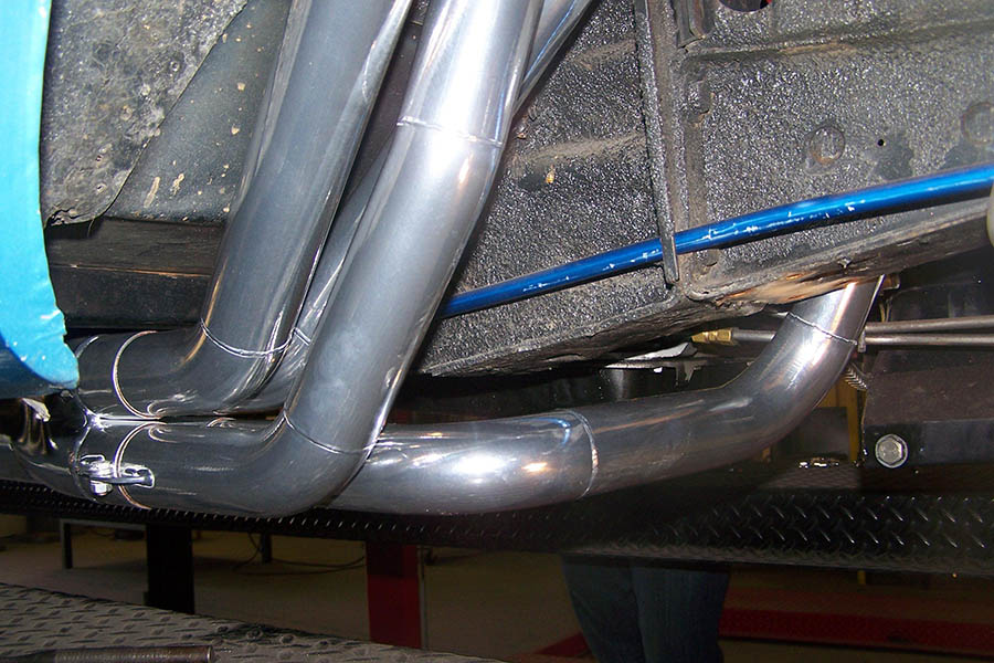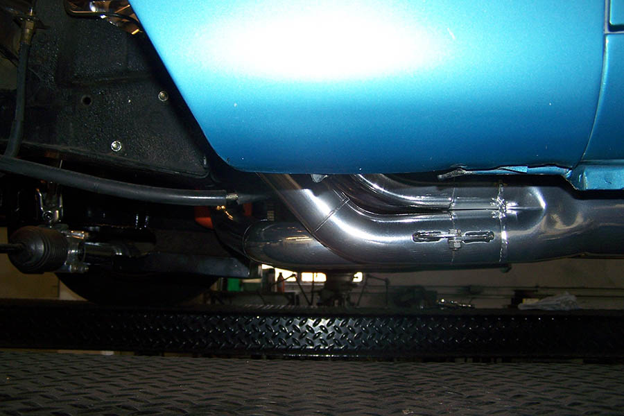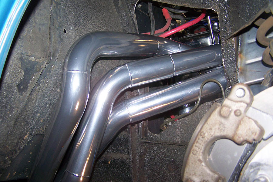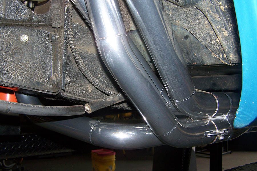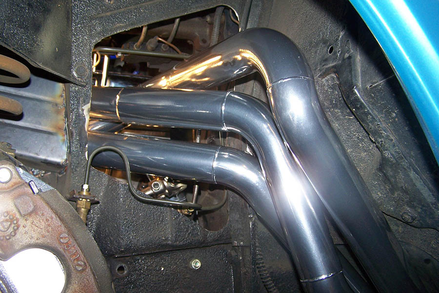 This header is available in any tube size up to 2 ¼” with any collector size up to 4” or our collector muffler up to a 5” size. The stock steering system forced us to design this header as a fender well style, but we kept the back tubes inside the frame for added tire room. These tubes turn under the frame and meet up with the collector facing back under the floor board. Because of #8 tube inside the frame a Hitachi style starter is required.