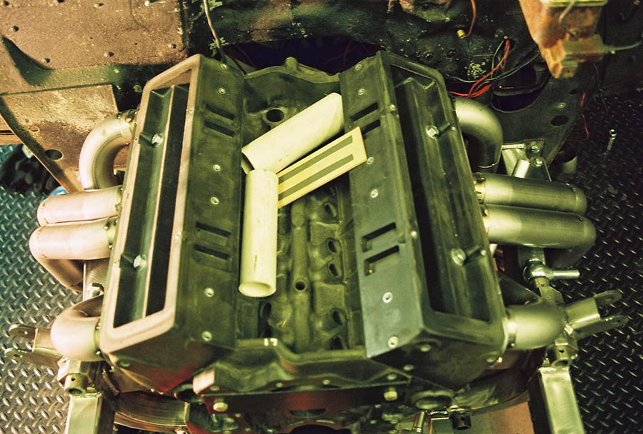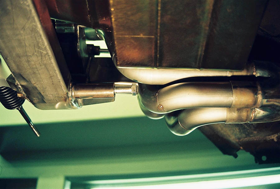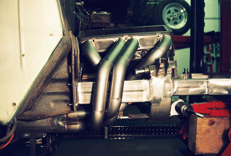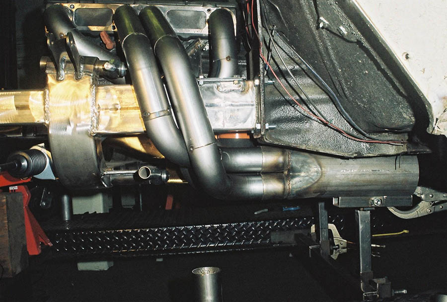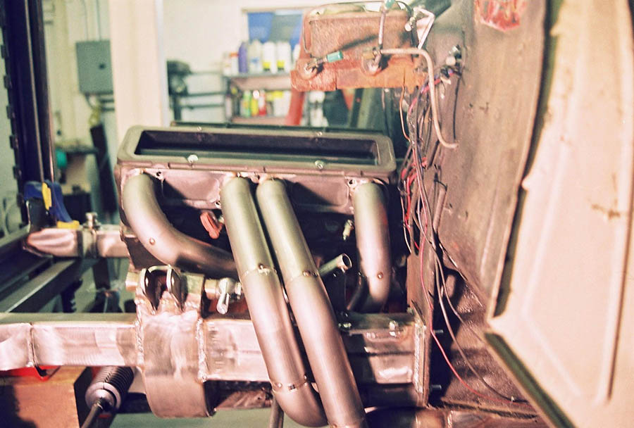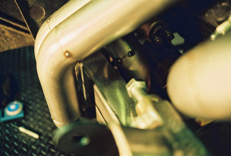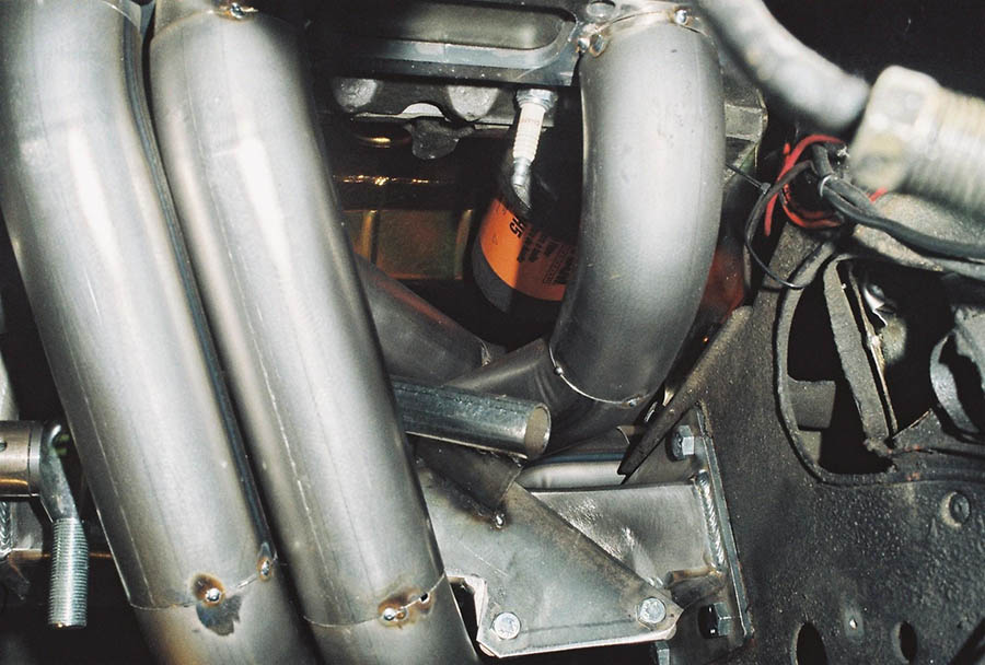 Because of the tubes around the frame we use our slip on type race collectors. The sequence for installing the headers is the same for both sides. With the engine in place install the front tube first from the bottom, then the rear tube from the bottom and last the center tubes which go around the frame. With the header bolts snug but not tight, install the collectors, bolt them on then tighten the header bolts. Installation is way too easy!