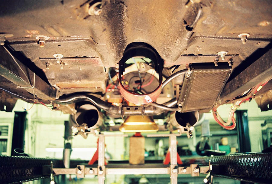 This header is available in any tube size up to 2 ¼” with a 4” collector or a 5” collector muffler. Designed for the Alston front clip it will fit side motor mounts or motor plates and the front sway bar kit. The steering column must be installed per Alston’s installation manual. Because of the large tube size this header was designed for we run the 2 center tubes on each side around the frame. This allowed us to keep plenty of oil pan room. Measuring out from the bottom of a stock oil pan we have 4 ½” of room on the driver side and 3 5/8” of room on the passenger side. The oil pan we used on our design car was a Milodon # 30900 which has a 1 ½” kick out on each side and we could still get the oil filter in and out. This header requires a mini starter, either a Hitachi style or a Nippondenso style. A full size GM starter will not fit.