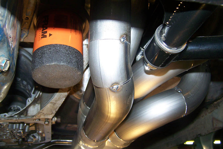 We kept the header as far away from the oil pan as possible for kick out sumps. On the driver side we have 3 ¾” of room and on the passenger side we have 3 ¼” of room. If the pan kick out is under the oil filter it will be trapped.