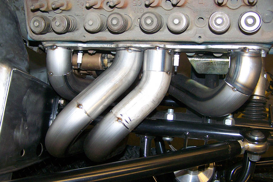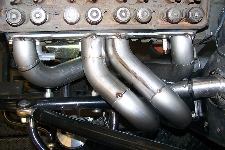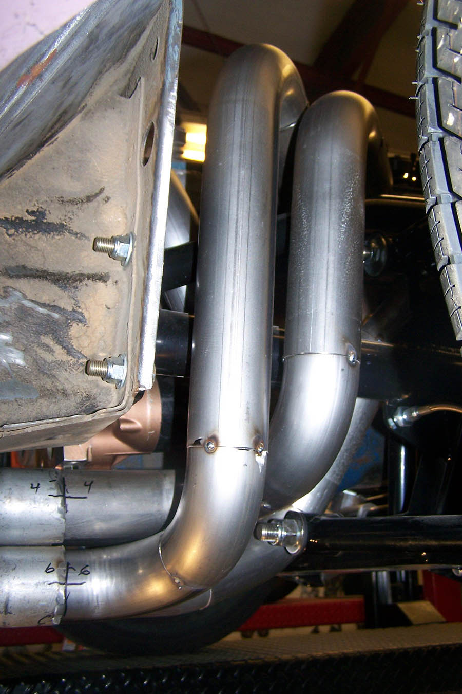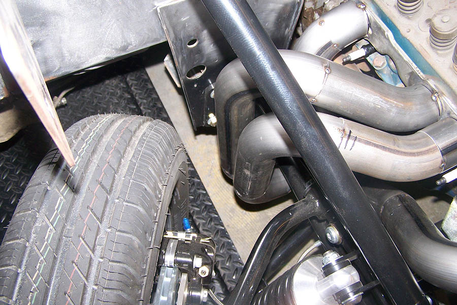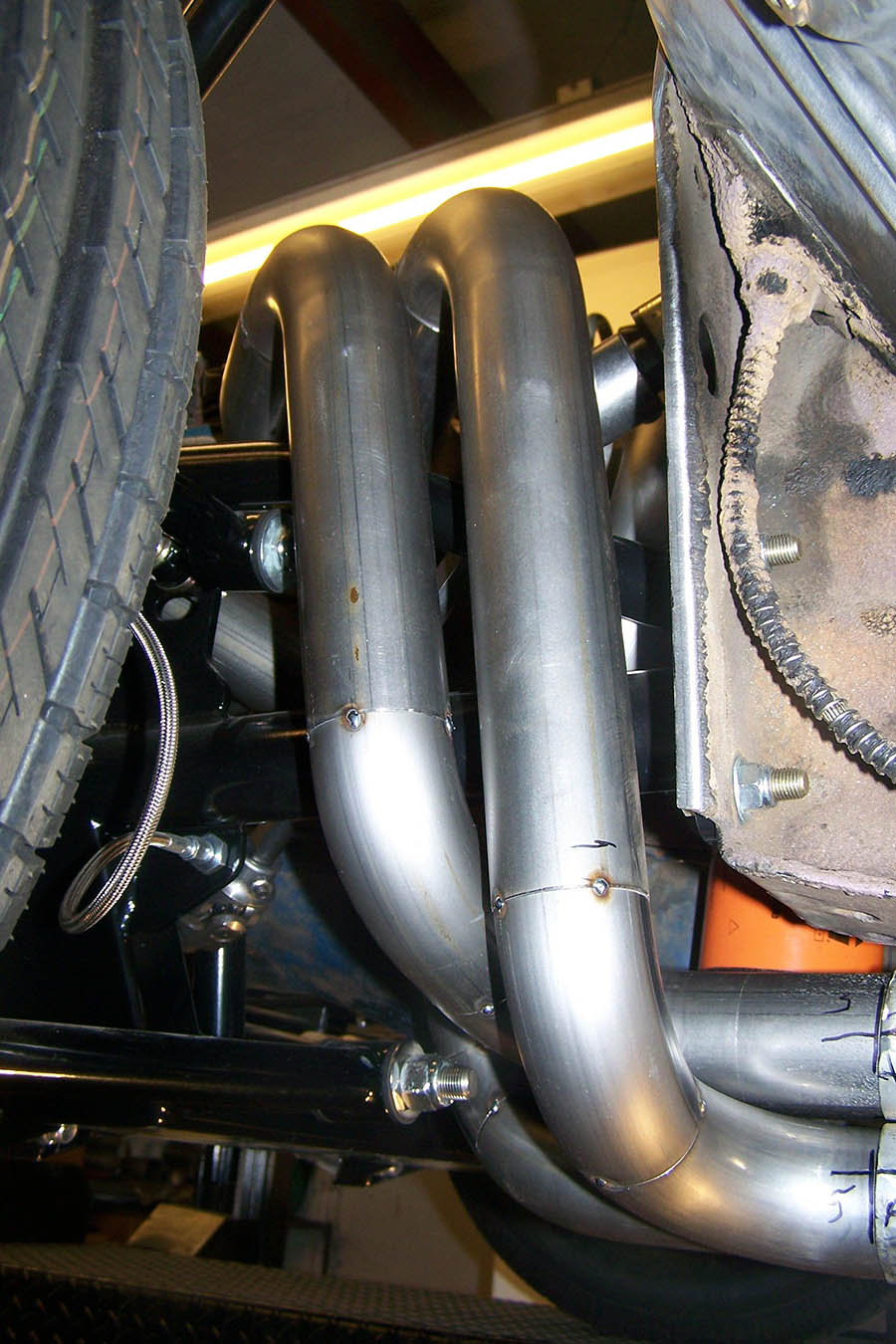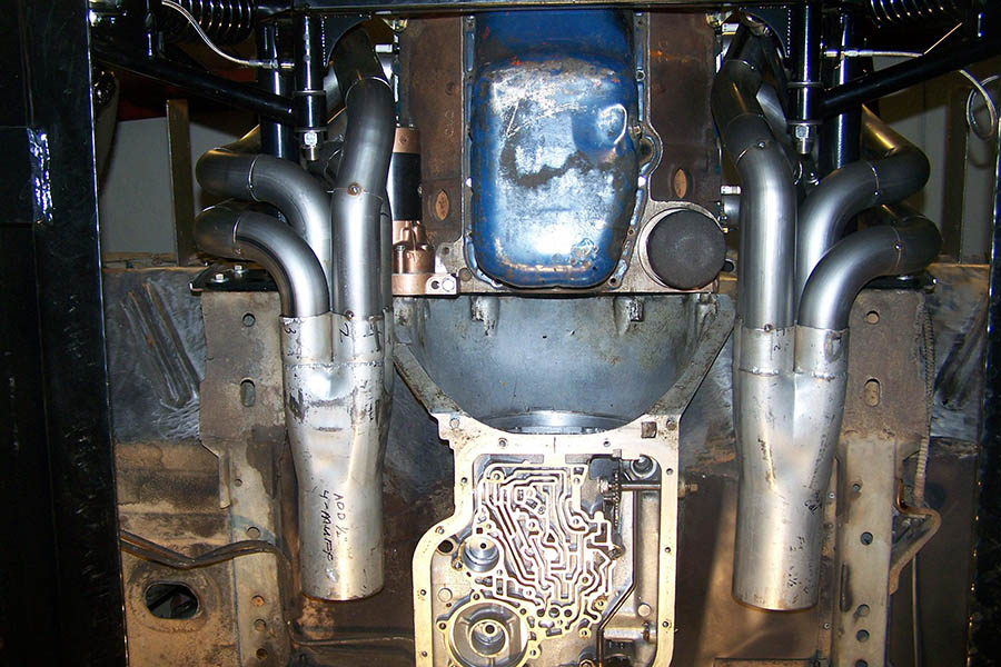 Because the frame rails on the TCI chassis are moved inward 1” on each side, this created some challenges in designing a large tube header. The front and back tubes are inside the frame with the two center pair going around the frame on both sides, (see photos). This allowed us to get the best possible ground clearance, oil pan room and spark plug access. Our design car had fairly narrow front tires and we had plenty of tire room at full turn.