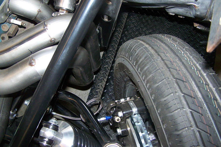 A 7” to 7 ½” tire should have room depending on the wheel offset. Ground clearance is excellent, the bottom of our 2 ¼” design header was slightly below the “K” member. Smaller tube sizes will gain ground clearance. (see photo)