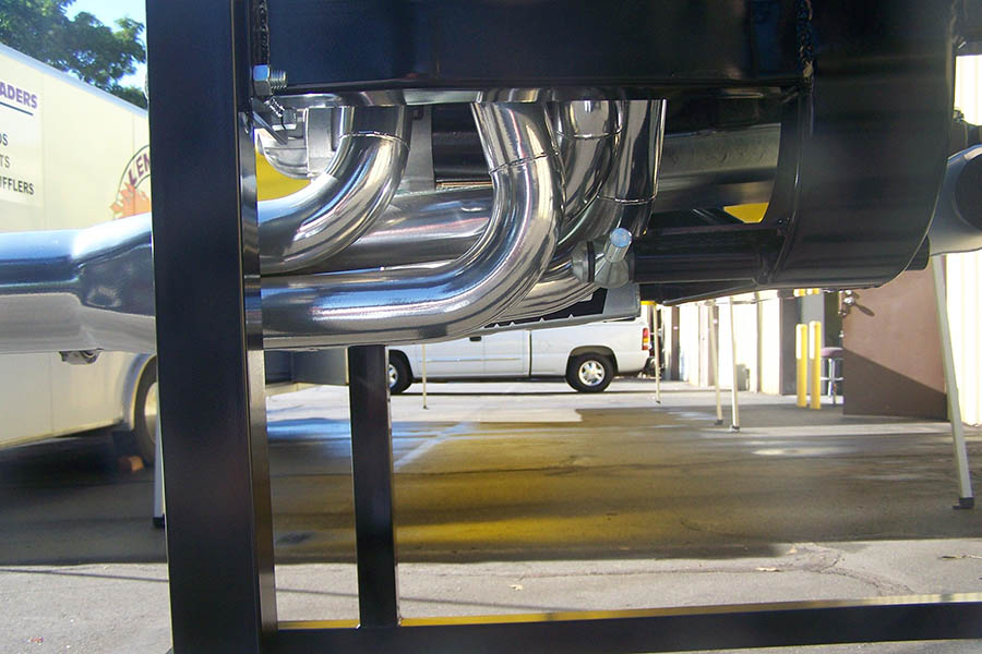 All of the tubes are inside the frame with excellent ground clearance and spark plug access. On our design car we used a stock oil pan and an aftermarket Moroso oil pan #20140 with side sump kick outs. We also used a stock starter and an aftermarket Power Master starter. The oil filter has easy access.