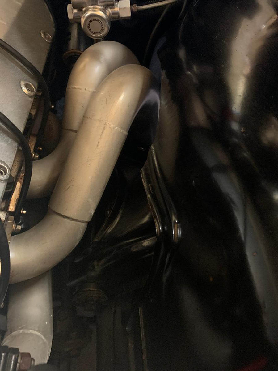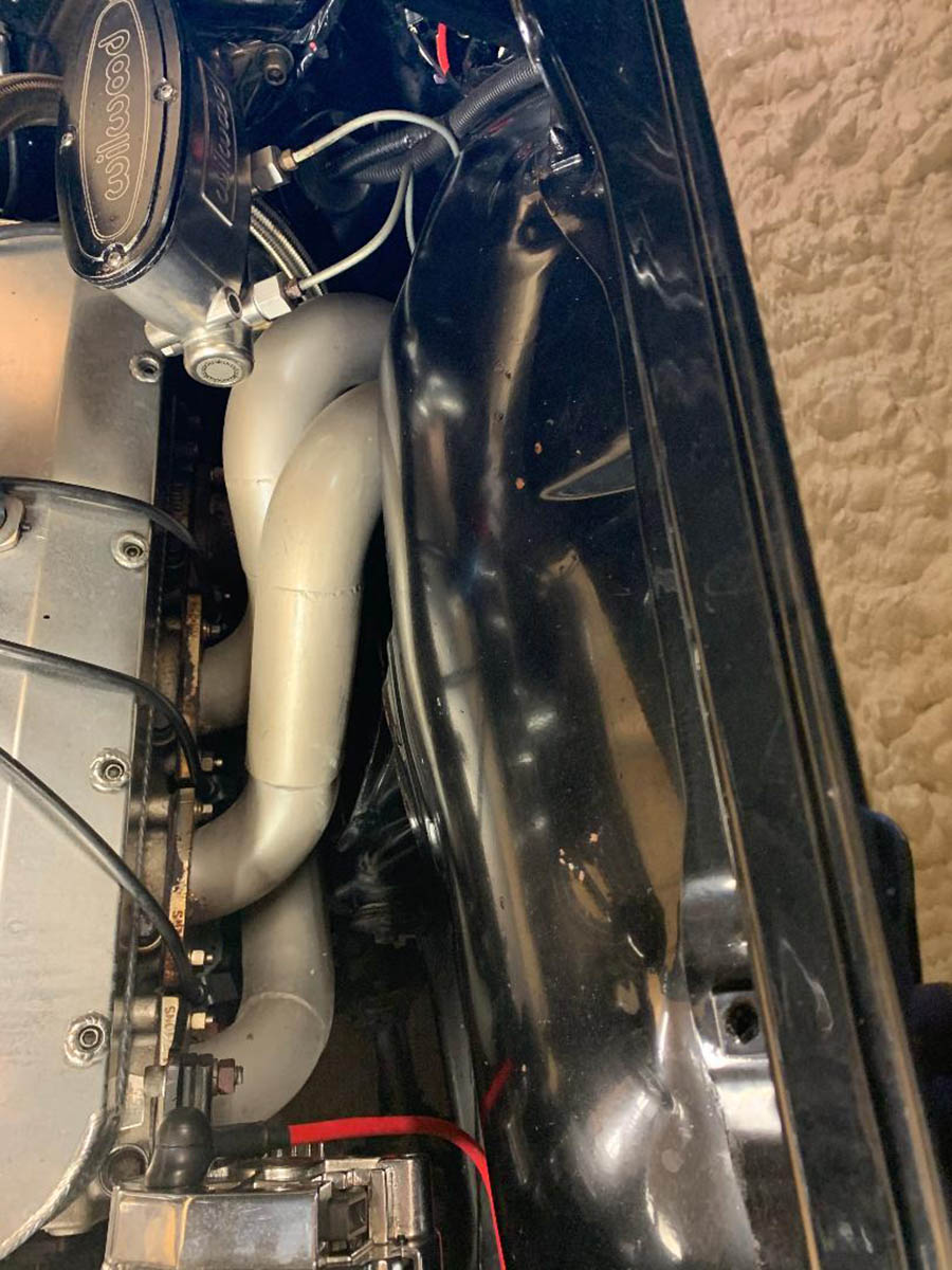 If you will be using your inner fender wells they will have to be trimmed to clear the tubes around the frame. The best way to accomplish this task is to mark a reference point on the fender well measuring from the “A” arm then remove the fender wells. Once the headers are installed use your reference mark and the “A” arm to measure from to determine the opening for header clearance. Make the opening large enough that the header can be taken in and out.