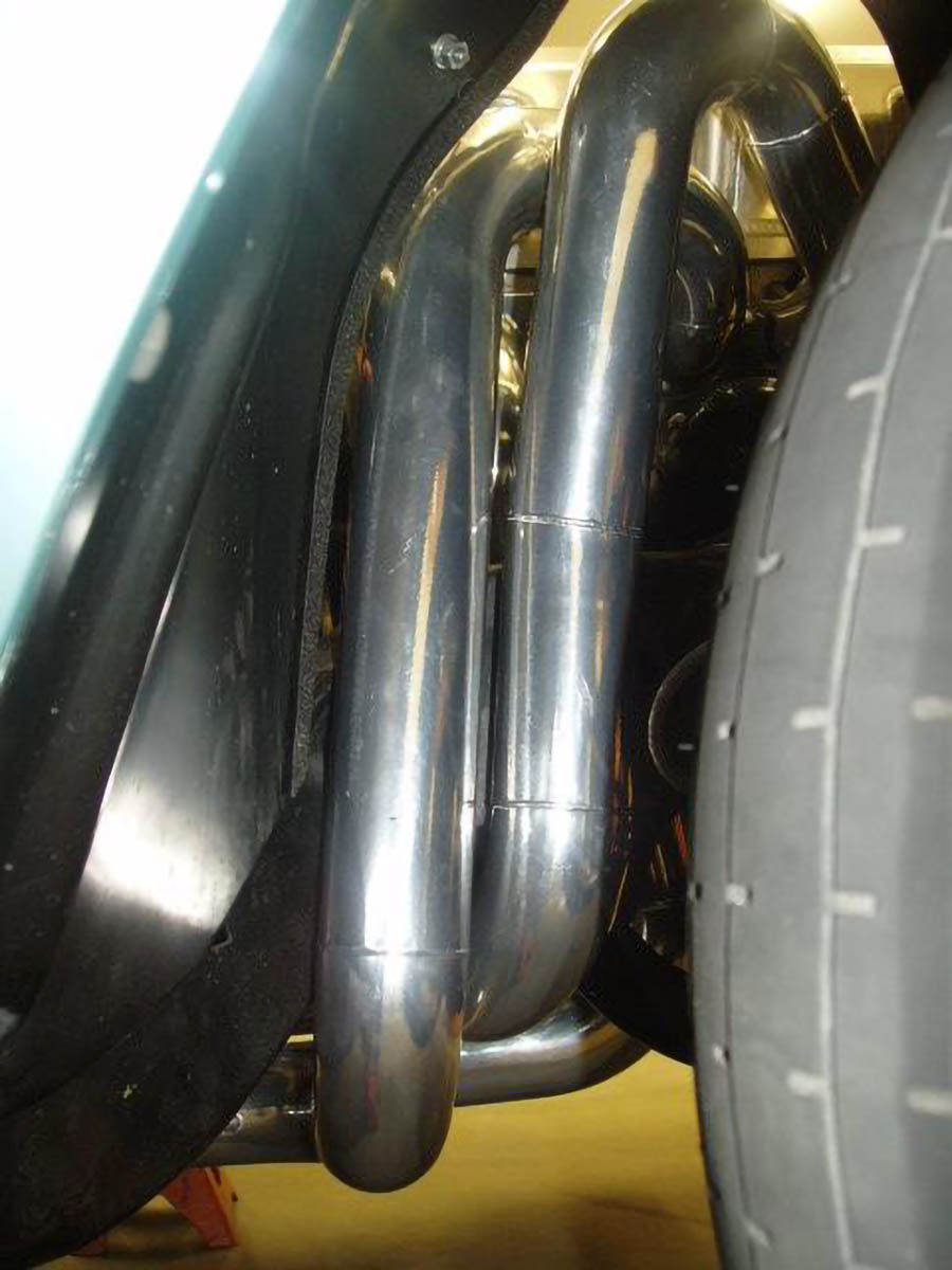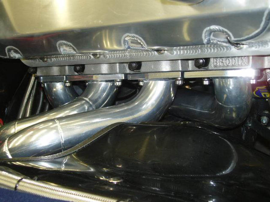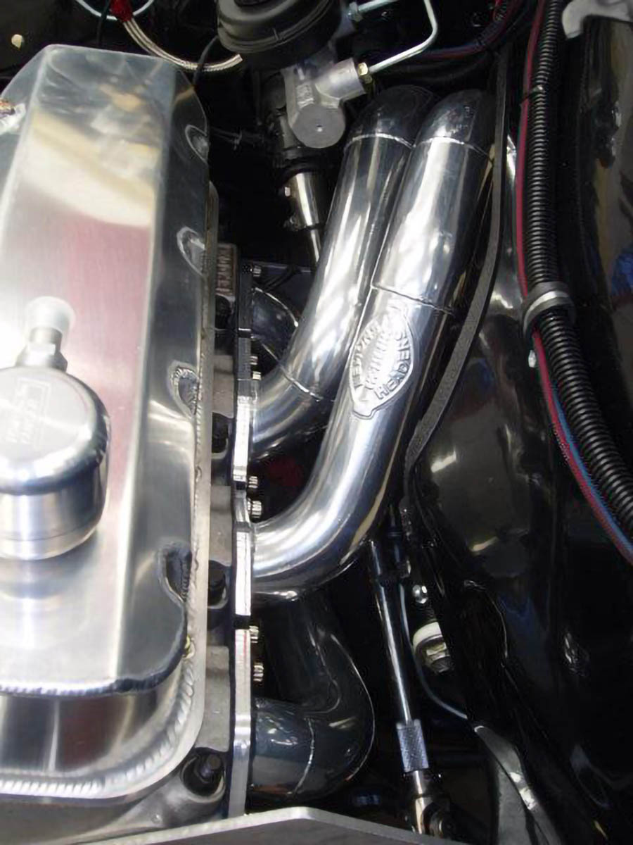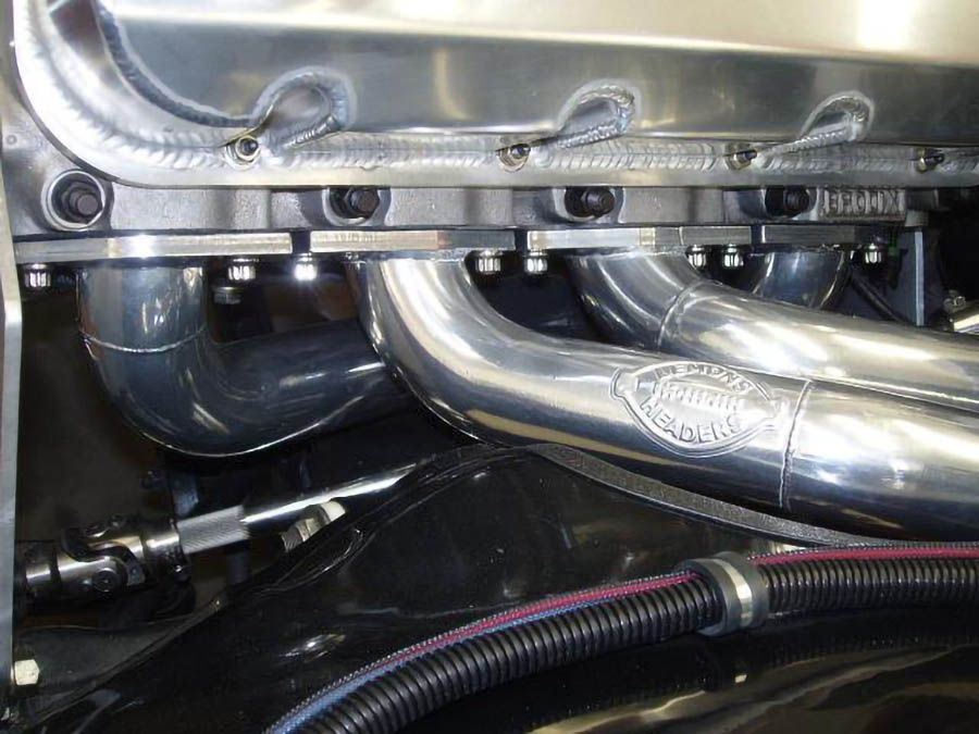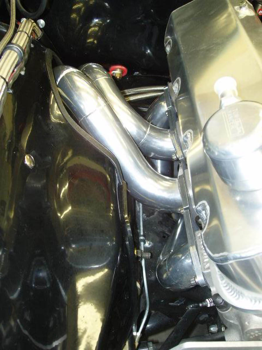 The available oil pan room for side kick out sumps, measuring from the side of a stock oil pan we have 3 ½” of room on the passenger side and on the driver side we have 2 ½” mid way down the pan and 4 ½” at the bottom of the pan. If the kick out on the oil pan is under the oil filter the filter may be trapped. A Milodon pan #30951 or #30956 and a Moroso #20408 oil pans give easy access to the oil filter. Ground clearance is excellent, with our largest tube size 2 ½”, the bottom of the header is ½” below the bottom of a stock oil pan. Smaller tube sizes will gain more ground clearance. Spark plug access is also excellent. With plug wires going over the valve cover we recommend using 45 degree or 135 degree boots, with plug wires going under the header use 90 degree boots