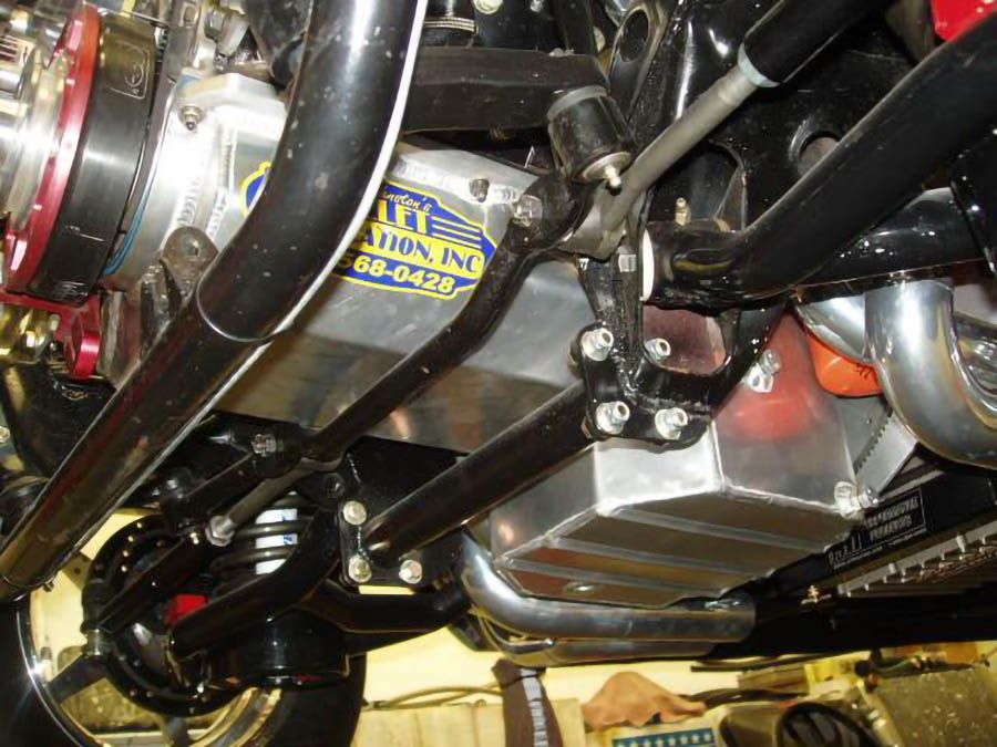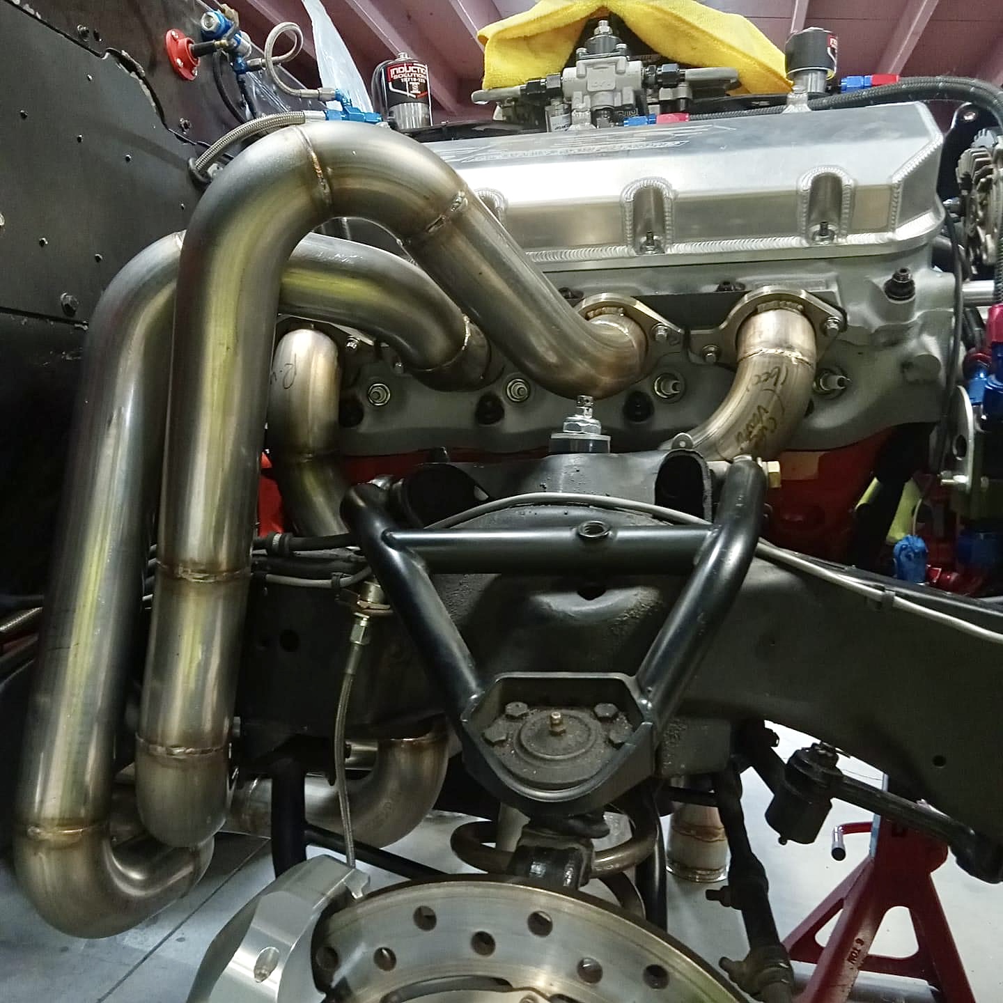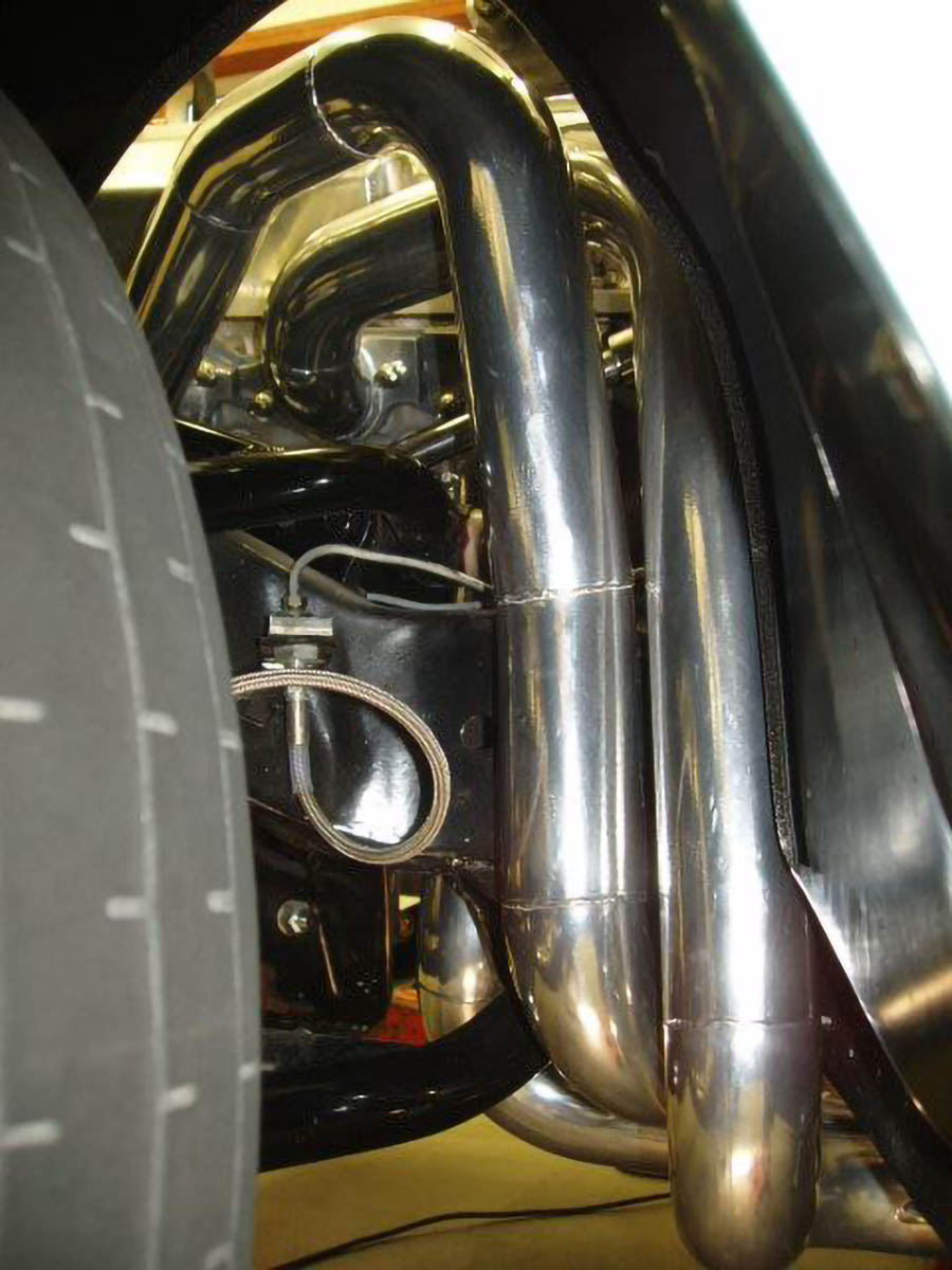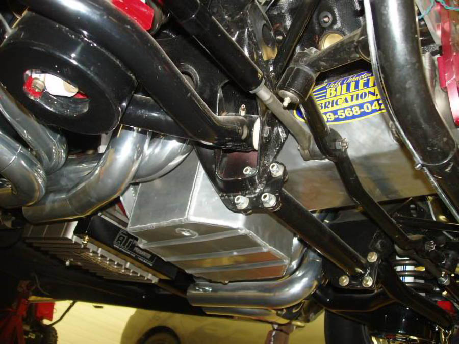 The available oil pan room for side kick out sumps, measuring from the side of a stock oil pan we have 3 ½” of room on the passenger side and on the driver side we have 2 ½” mid way down the pan and 4 ½” at the bottom of the pan. If the kick out on the oil pan is under the oil filter the filter may be trapped. A Milodon pan #30951 or #30956 and a Moroso #20408 oil pans give easy access to the oil filter. Ground clearance is excellent, with our largest tube size 2 ½”, the bottom of the header is ½” below the bottom of a stock oil pan. Smaller tube sizes will gain more ground clearance. Spark plug access is also excellent. With plug wires going over the valve cover we recommend using 45 degree or 135 degree boots, with plug wires going under the header use 90 degree boots