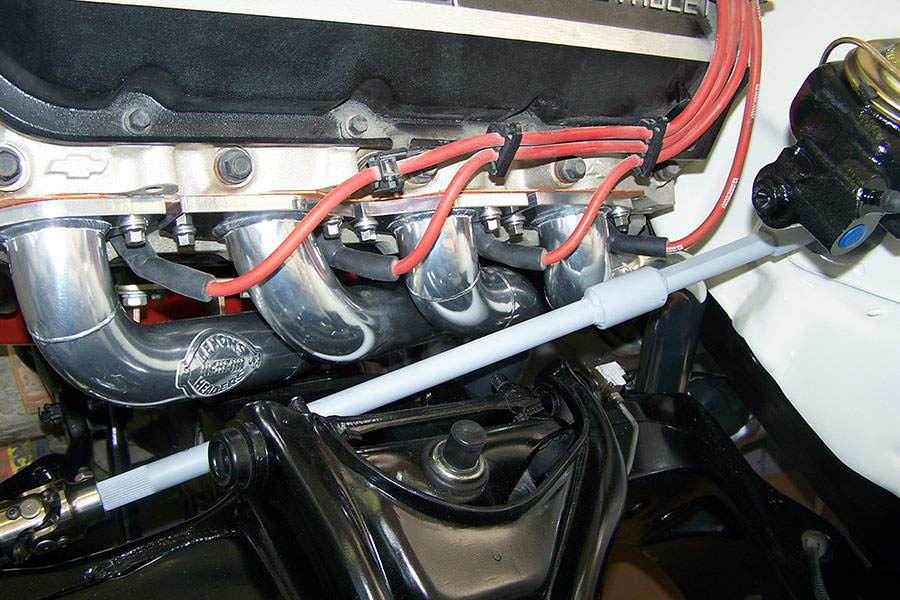 The steering column is the big issue with this chassis, but we still have good access the spark plugs. The header is also designed for clutch linkage and a power brake booster. If you are using a Lakewood type scatter shield you will have to slightly trim the outer edge of it under the starter area for header clearance. If your car has factory air conditioning we can make the header for that.