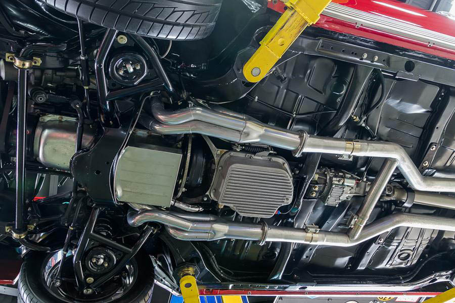 This header is available in a 2” or 2 1/8” tube size with a 3 ½” collector. All of the tubes are inside the frame. Our headers are hand made to order, so we can build them for any engine deck height and for any aftermarket cylinder head as long as the engine stays in the stock location. On the ’64 thru ’67 Chevelle chassis, small block frame stands for the front motor mounts are required. We used Prothane polyurethane engine mounts #7-504 to design with. The header will also fit solid motor mounts Moroso #62530.