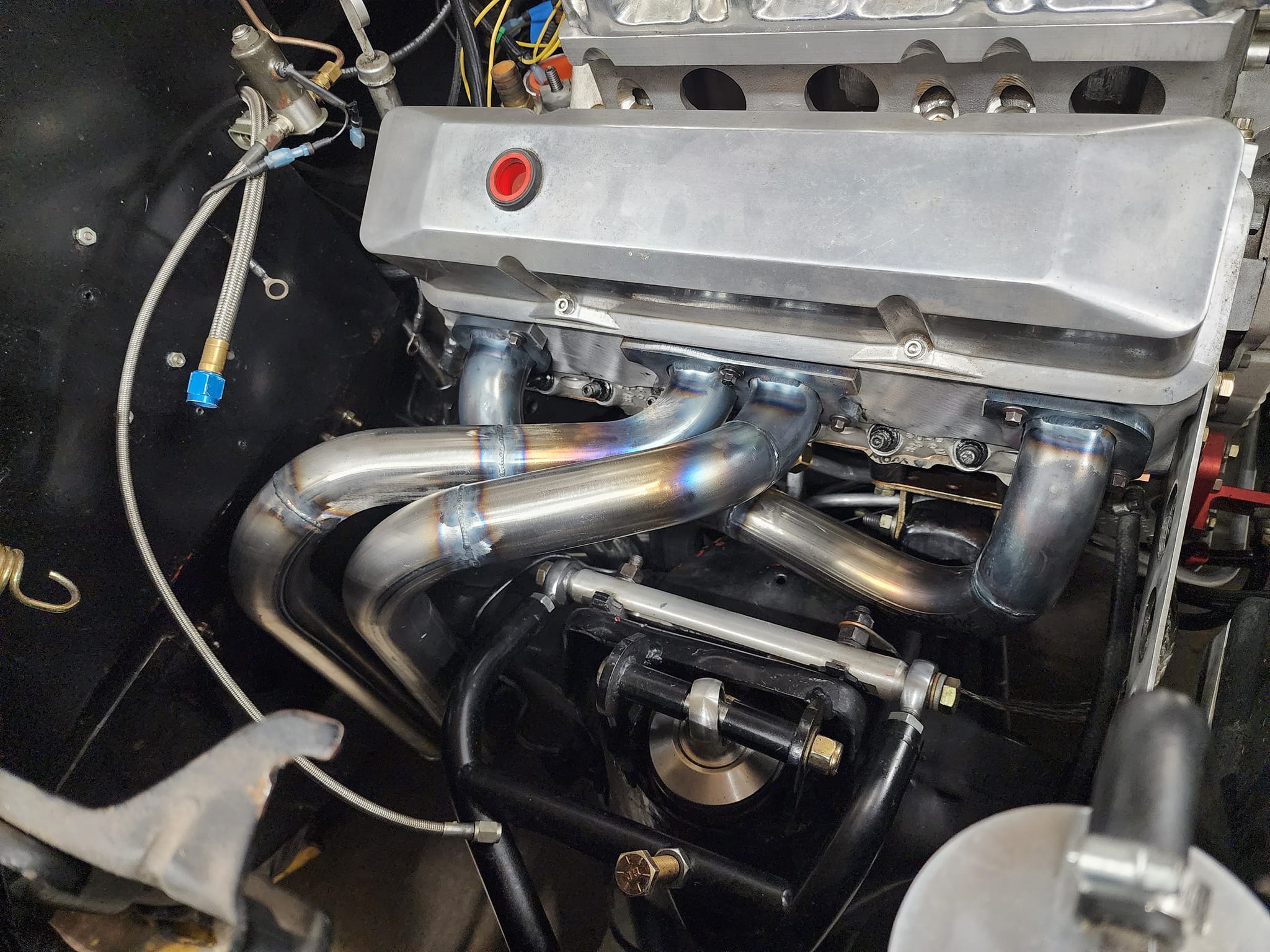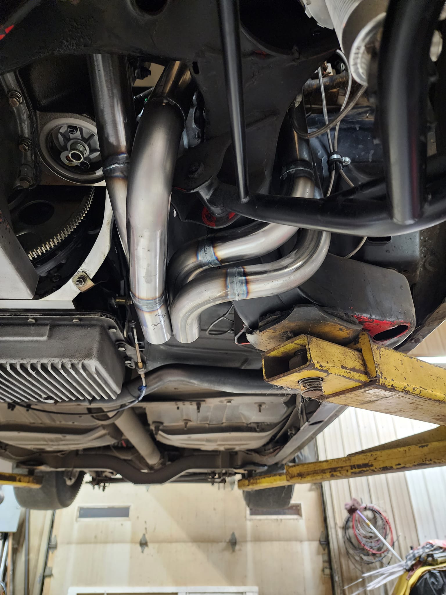 This header is designed for any tube size up to 2 ¼” with any collector size up to 4” or our collector muffler up to a 5” size. The design has 2 tubes on each side that go around the frame. The engine needs to stay in the stock location. The header will fit side motor mounts or motor plates. This header will fit any mini starter except a CVR and will not fit a factory GM full sized starter. It has approximately 3” of room at the bottom of the oil pan for kicked out sumps. This header is meant to be used with a skinny drag racing type front tire for maximum turning radius and has clearance for aftermarket “A” arms. We held the header and collector up as high as possible for maximum ground clearance. If you will have a large exhaust system we have a chrome moly replacement transmission cross member for added clearance. This header will fit clutch linkage. Your master cylinder brake lines will have to be rerouted. It is not intended for use with an air conditioning box on the fire wall, power brake booster or column shifter linkage.
