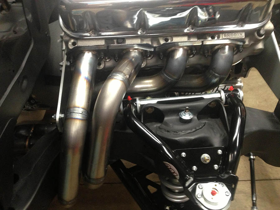 We designed this header with the engine in the stock location setting on small block frame stands for the front motor mounts with Moroso #62510 solid motor mounts or Prothane #7-505 polyurethane motor mounts. It has 2 tubes on each side that go around the frame which will require that you trim your inner fender wells for clearance. It also allowed us to get the best possible ground clearance, oil pan room and spark plug access.