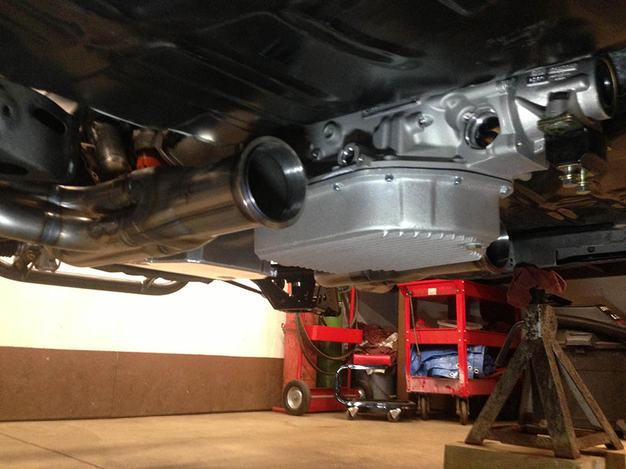 This header will fit almost all mini starters except a Mezier #400, and will not fit a stock GM full sized starter. Available oil pan room for kicked out sumps, measuring from the side of a stock oil pan we have 4 ½” of room on both sides. The oil filter is very accessible and the starter can be removed unless you have a big pan kick out. Spark plug access is very good we recommend using a 45 or 135 degree angled spark plug wiring boot. We hold the headers and collectors up as high as possible for ground clearance. The bottom of the header is even with the bottom of a stock oil pan. If you will be using a large exhaust system we offer a replacement chrome moly transmission cross member for additional exhaust room.