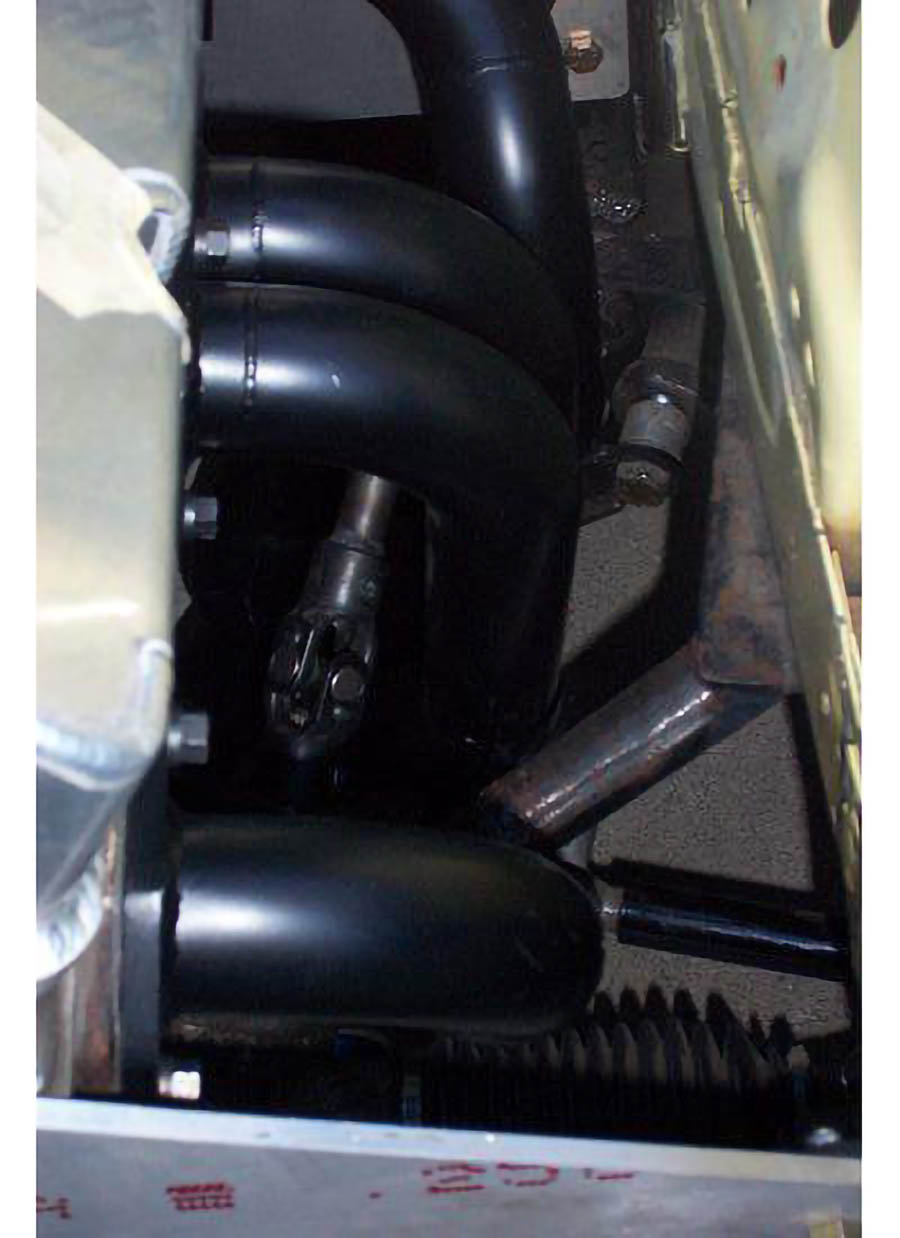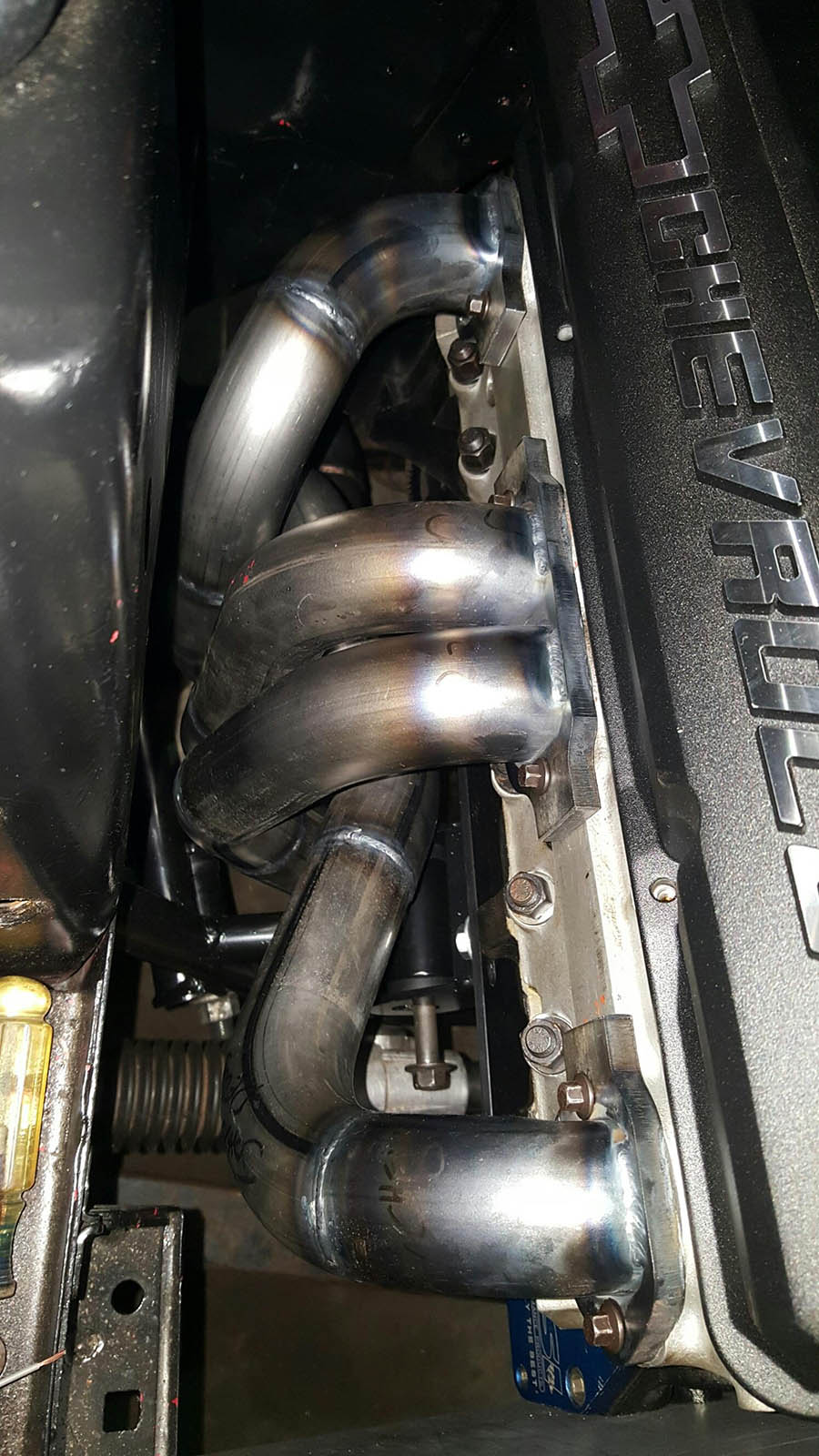 This header is designed for any tube size up to 2 ¼” and any collector size up to 4” or our collector muffler up to a 5” size. It was designed using an AJE aftermarket “K” member with their side motor mounts to position the motor in the same location that the Ford engine was located. It will also fit motor plates. All tubes are inside the frame. The engine can be set back. It will fit any mini starter except a CVR and will not fit a stock GM full size starter. The oil pan has 3” of room on the driver side and 2 ½” on the passenger side for oil pan sump kick outs. We kept the header up as high as we could for ground clearance the front of the header is higher than the back of the collectors and the collectors are as high as we could go and still have room for an exhaust system.