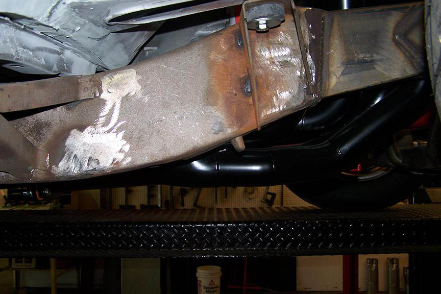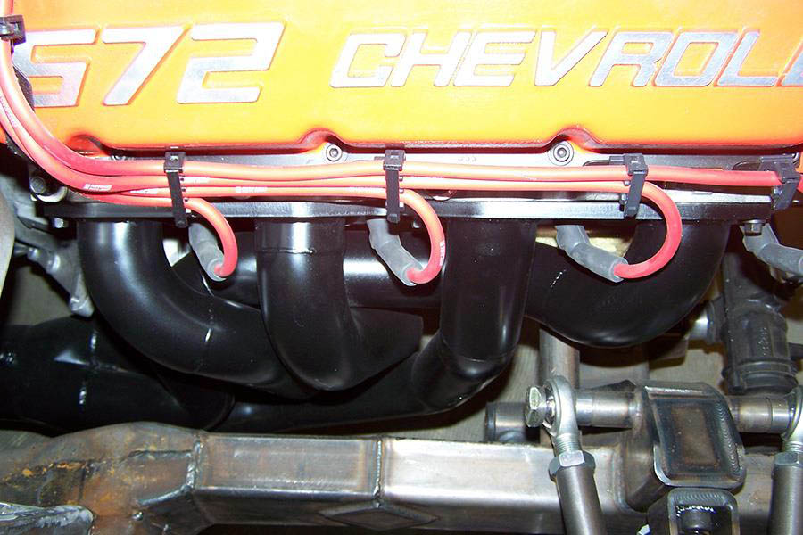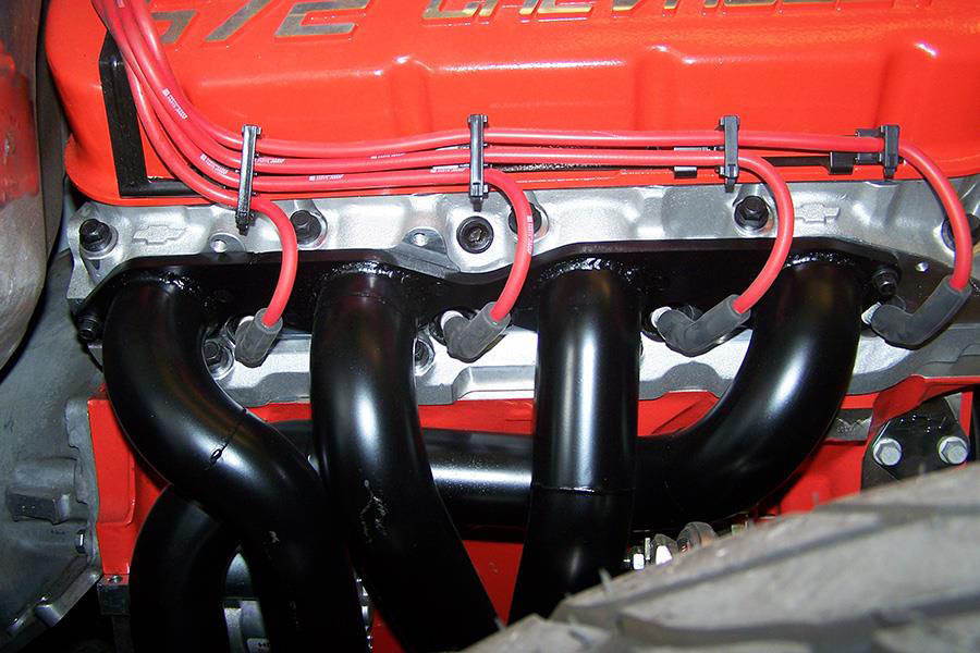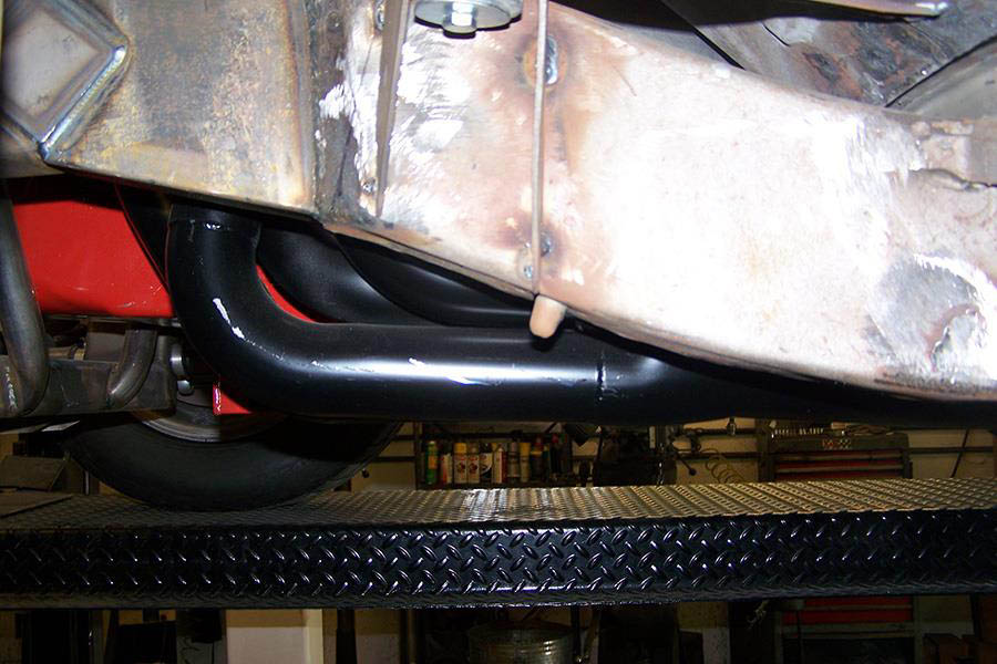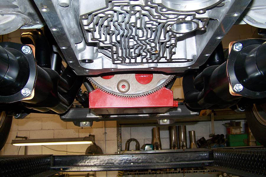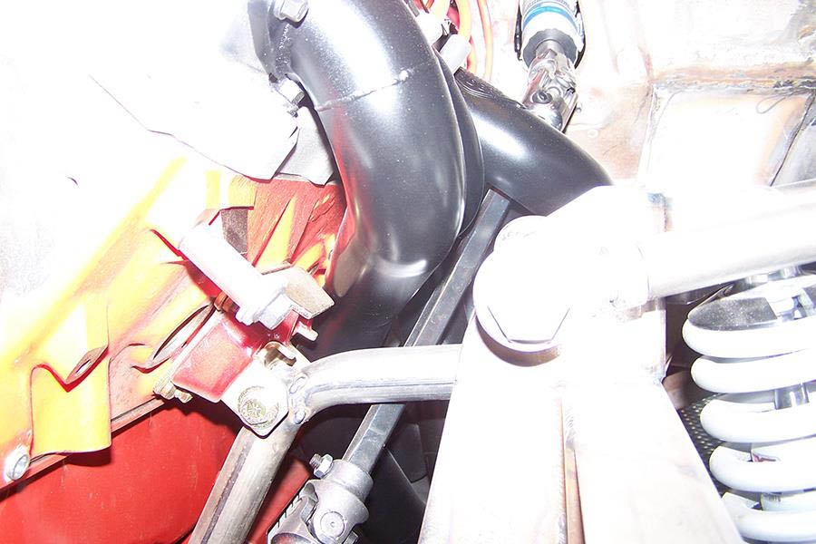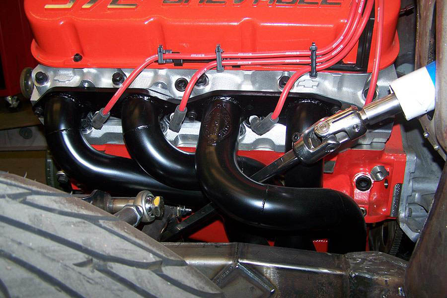 Header built in the Pro-Tour style. Driver side, remove the center section of the steering column (between the 2 U joints), remove the oil filter. If the factory ears have been cut off of your automatic transmission then this header will install from the bottom without raising the engine.