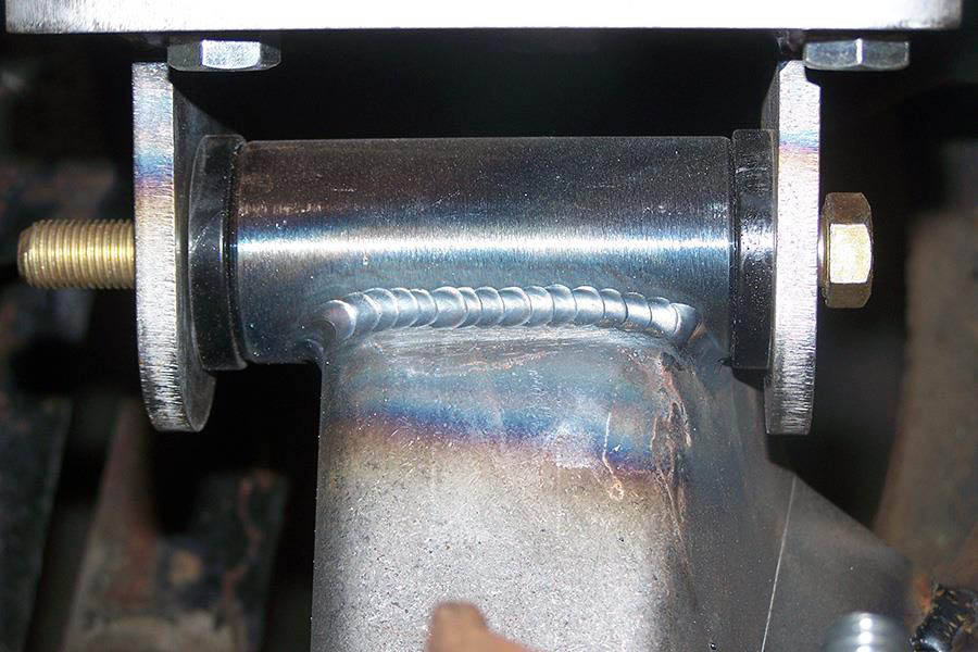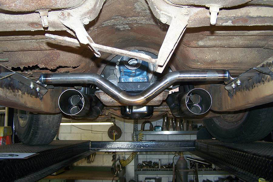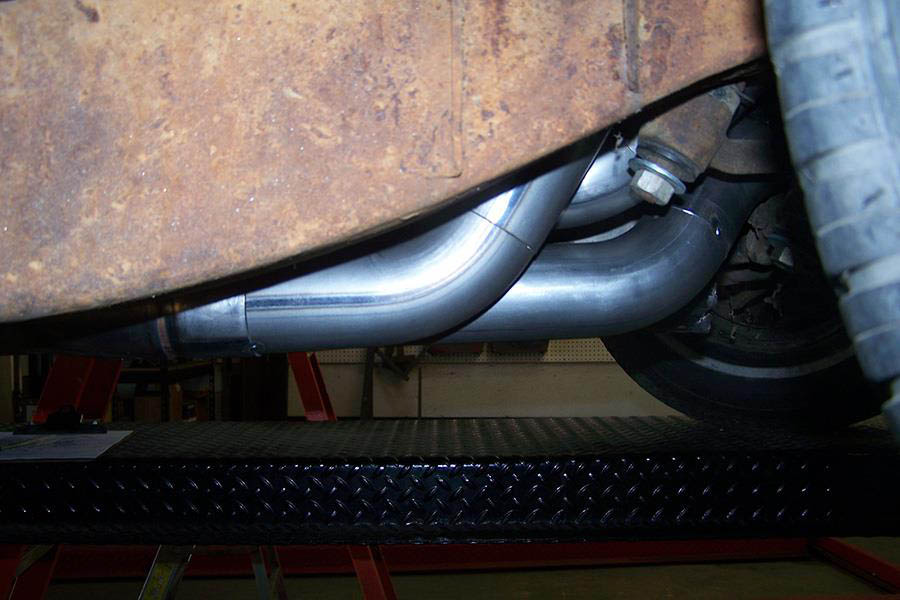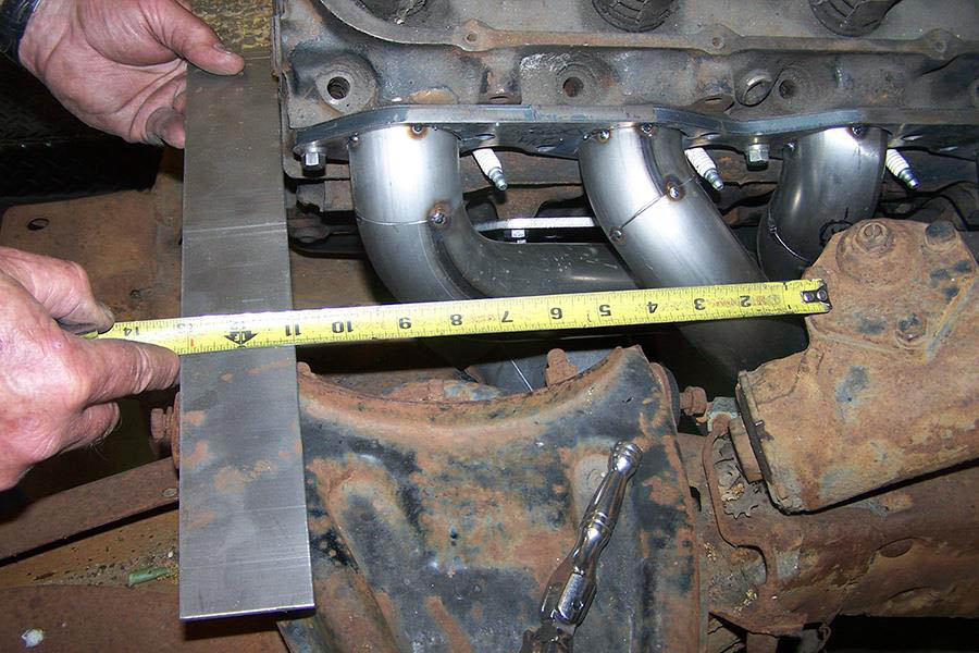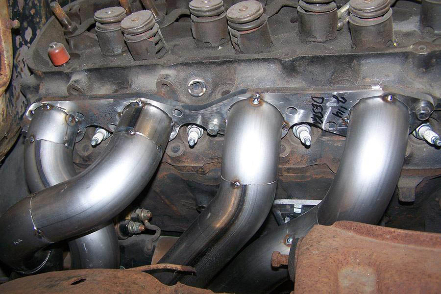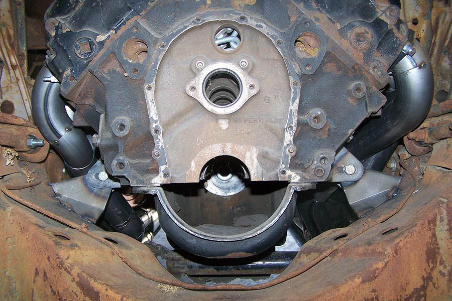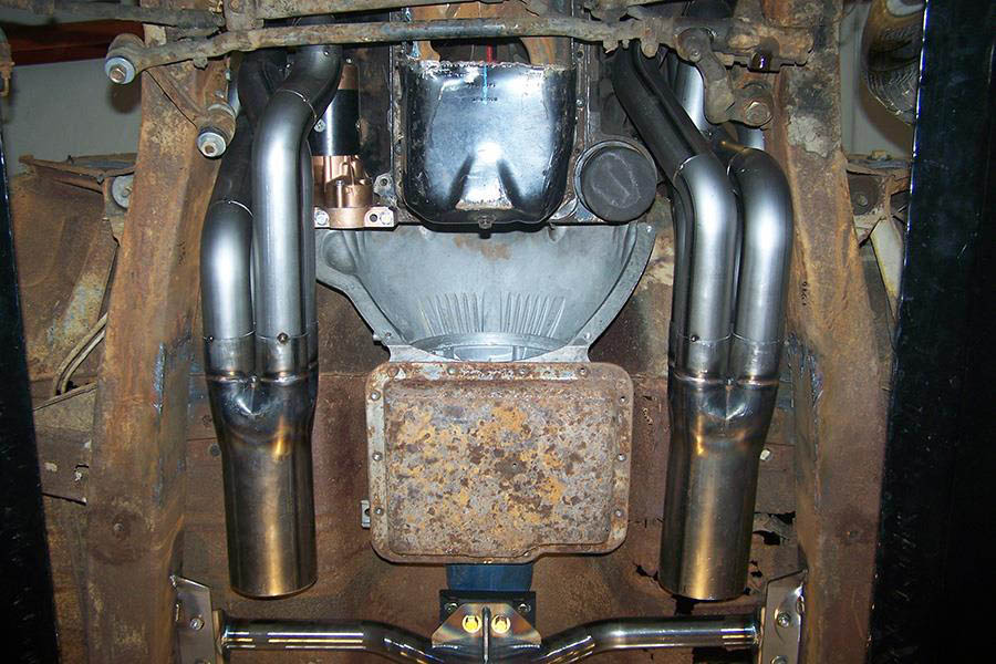 This header can be built in any tube size UP TO a 2 ¼” stepped to 2 3/8” primary with UP TO 4 ½” collectors. All of the tubes are inside the frame. Our headers are hand made to order so we can build them for any engine deck height and for any aftermarket cylinder head as long as the engine is in the correct position. On our design car we used Earl Williams Classics (909-392-1358) new style side engine mounts and transmission cross member (see photo’s). These motor mounts position the engine ¾” forward from the stock position for firewall clearance and centered the engine in the frame. If your engine is forward or back from this position we can compensate for that up to about ¾ but” the engine must be centered. With a BB in these cars the steering box is the big issue.