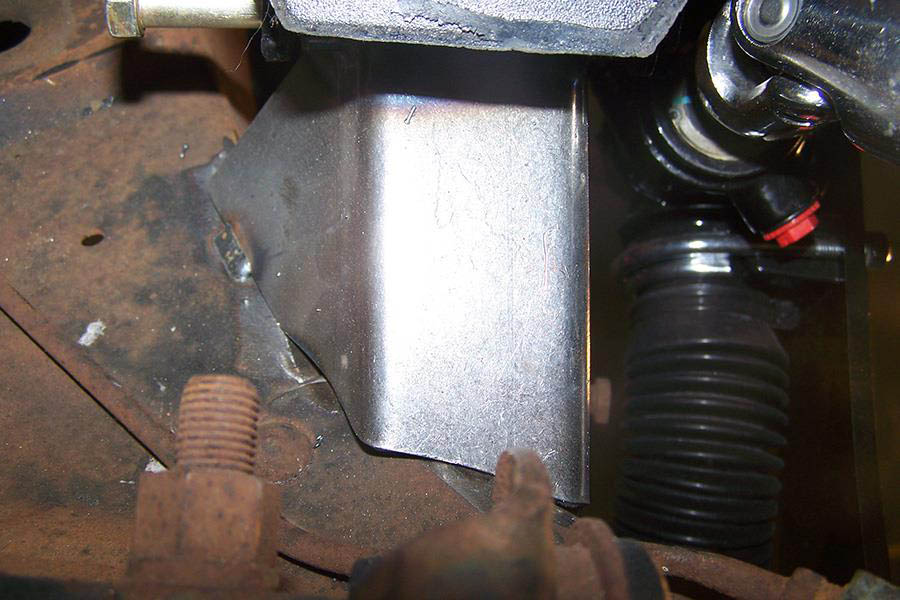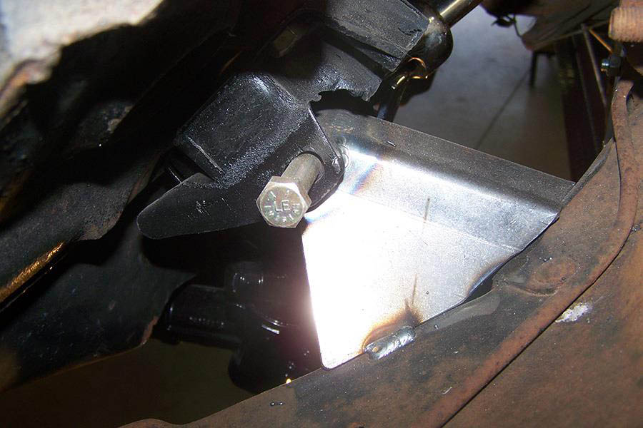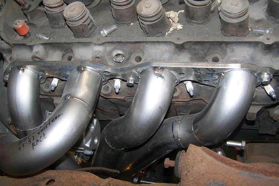 On our design car we used a Danchuk #12184 motor mount kit, these mounts position the engine ¾” forward from the stock position to give your Big Block Firewall room. This header will also fit motor plates. We also used a Unisteer Tri-5 power steering rack #8010600-01. The mounting bracket bolts directly to the frame, using existing bolt holes in the frame. Other racks may not fit.