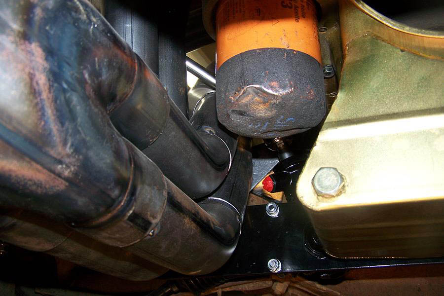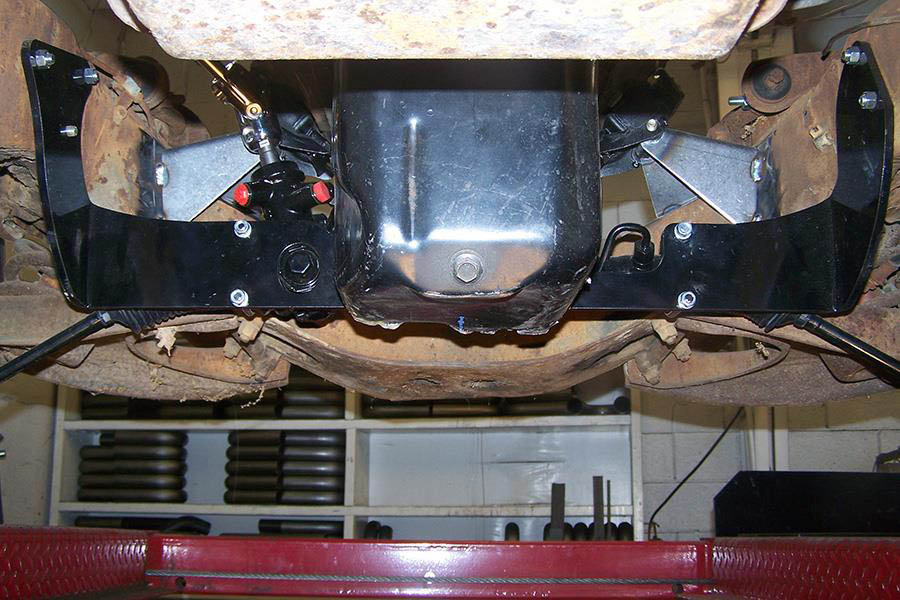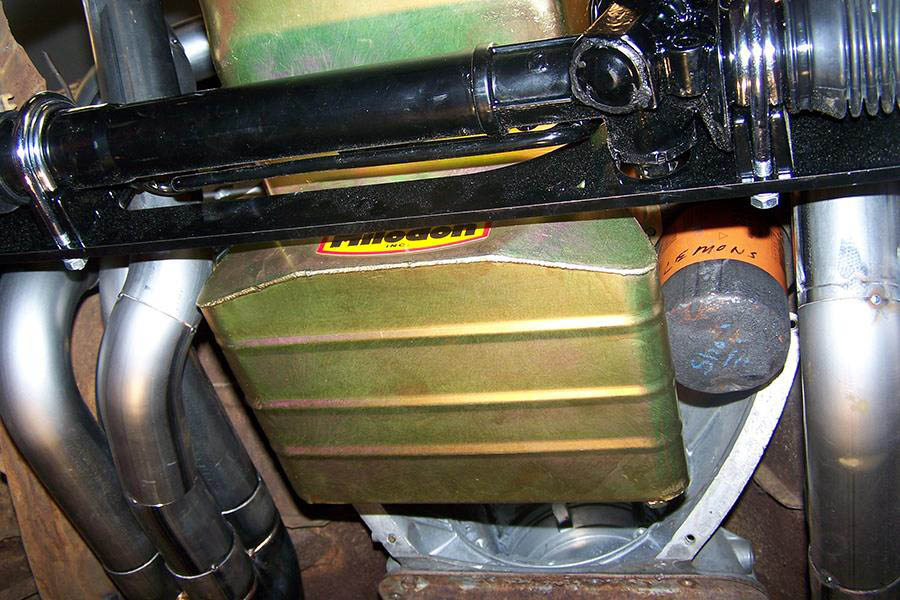 Milodon #31100, #31105, #30970 or #30975 six quart oil pans will fit with this rack and header combination. The available room for oil pan sump kick outs is 2”+ on the passenger side and 4¼” on the driver side. The #30970 and #30975 oil pans have qa kicked out sump and will trap the oil filter. The #31100 and #31105 pans are deeper and have no kick outs, so the oil filter will be accessable.