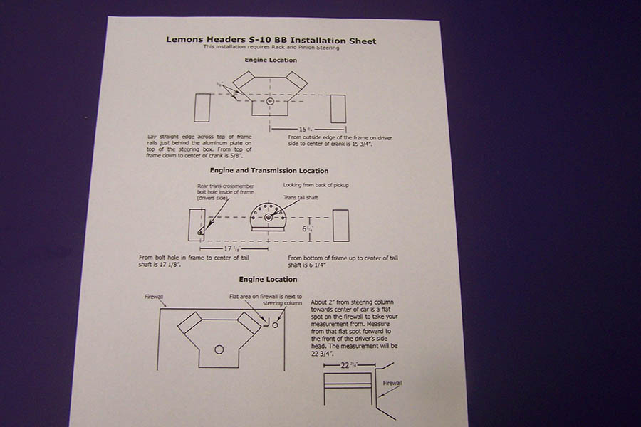 This header is designed for any tube size up to 2 ½” with any collector size up to 5” or our collector mufflers up to a 6” size. Three tubes on each side go around the frame. The position of the engine is important for proper fit. This design requires motor plates and a rack and pinion steering. Attached is a diagram showing the required engine location. The steering column will have to be lowered where it comes through the fire wall. The back side of the “K” member will have to be notched for the oil pan sump. This is a very complex engine swap.