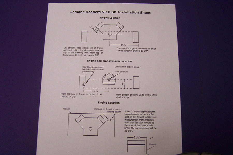 This header is designed for any tube size up to 2 ¼” with any collector size up to 4” or our collector mufflers up to a 5” size. Three tubes on each side go around the frame. The position of the engine is important for proper fit. The stock steering column can be used. Attached is a diagram showing the required engine location. Customers feed back has told us that Advance Adapters motor mounts will work. The back side of the “K” member will have to be notched for the oil pan sump.